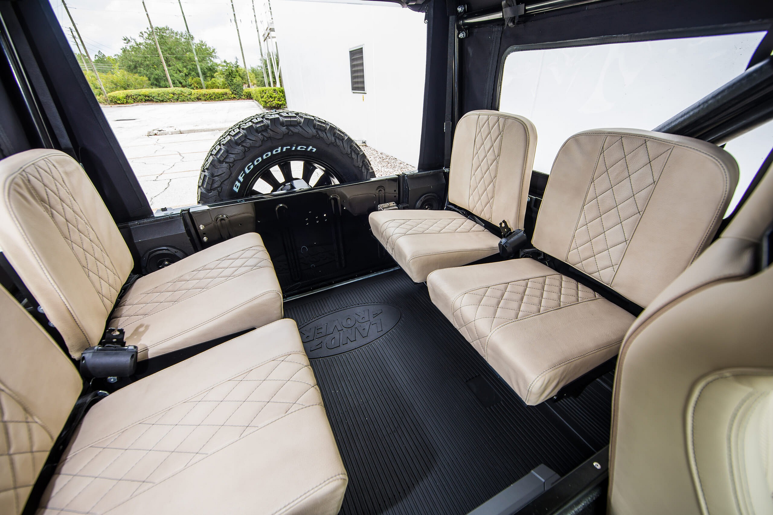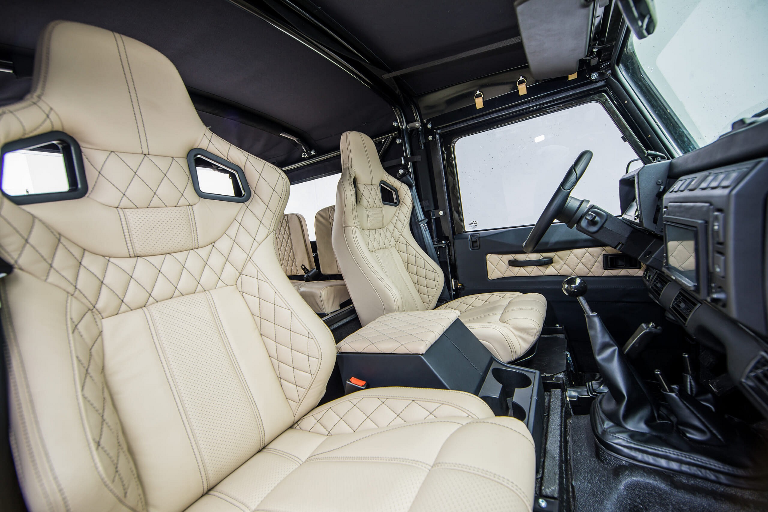 The seats are ivory leather Corbeau buckets in front with matching folding jumpseats in the rear.