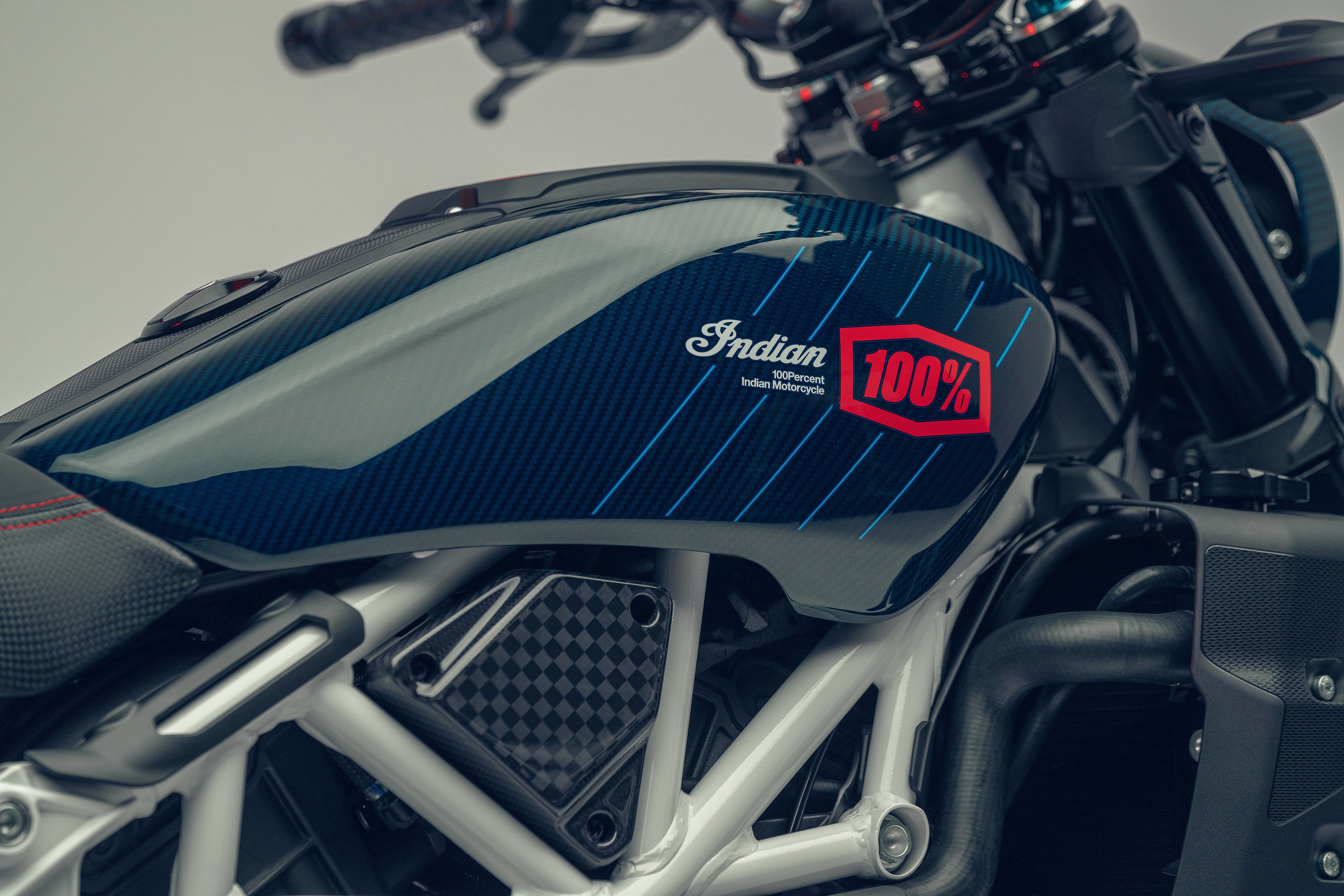 A Blue Candy color scheme covers the carbon fiber tank, headlight nacelle, seat cowl and front fender, while contrast comes from the powder-white frame, a black Ohlins rear shock and front fork, black Akrapovic exhaust, and black carbon pieces. Indian Motorcycle and 100% co-branding mark the collab on each tank side, the rear seat cowl and the chin fairing, as well as on an apparel collection of short sleeved tops, hoodies, hats, beanies, and sunglasses.