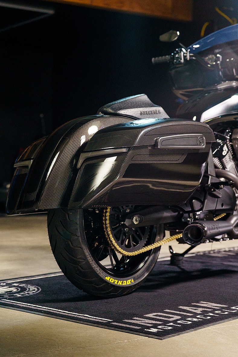 One of my really good lifelong friends, Jeremy “Twitch” Stenberg, and his buddy, [Seth Brisson], mentioned something about the the Forged series that Indian is doing. And Twitch was like, “Dude, would do you want a bike?” And I was like, “Is that a trick question, bro? Of course.” He said they’re going to do the Chieftain PowerPlus, the bagger. And I was like, “Dope, but can set it up like a dirt bike for me? Twitch said, “Bro, I got you.” The Chieftain PowerPlus straight off the showroom floor is a stunner—it’s so sick, it’s so capable, the torque is insane. But then you put it in the hands of Twitch and Seth and the thing turned into a monster, bro. And what I wanted was like Knight Rider. I kept telling him, “Just make it Knight Rider for me. Like every variation of black and carbon fiber that you can.” They did that and then some.
