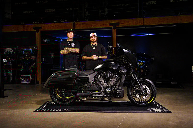 As fate would have it, the latest season of Indian Motorcycle’s Forged web series documenting celebrity custom bike jobs is hosted by motocross legend Jeremy “Twitch” Stenberg, one of Sheckler’s lifelong friends. Stenberg tapped Sheckler as the recipient of his first Forged canvas, a 2025 Chieftain PowerPlus that, with a 112 cubic-inch engine producing 128 pound-feet of torque and 122 horsepower, is among the baddest baggers on the market. Fully incorporating Sheckler’s desire for a Knight Rider-inspired aesthetic, Twitch opted for a mostly black monochrome paint scheme and scarce pops of color. Several custom components include a Baja Designs LP6 headlight and flood lights, blacked-out Arlen Ness wheels, a blacked-out Two Brothers Racing 2-into-1 exhaust and plenty of carbon fiber.