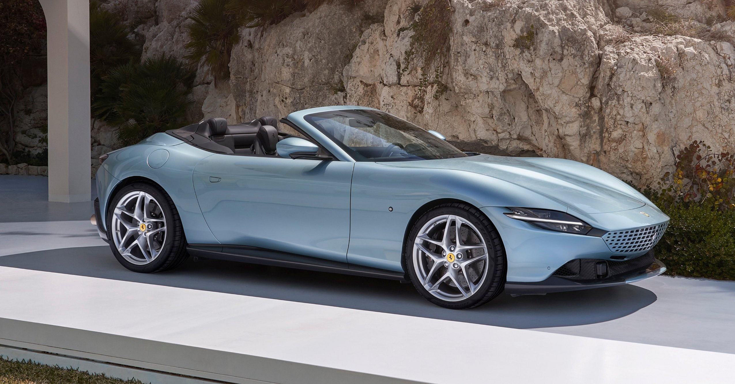 Like the Roma coupe, the Roma Spider features a stretched “shark-nosed” front hood that flows into a sculpted body free of any inessential panels, cuts or vents. Even the requisite grille—flanked by two linear LED headlights—is minimal, with a unique new perforated form that’s color-matched to the car.