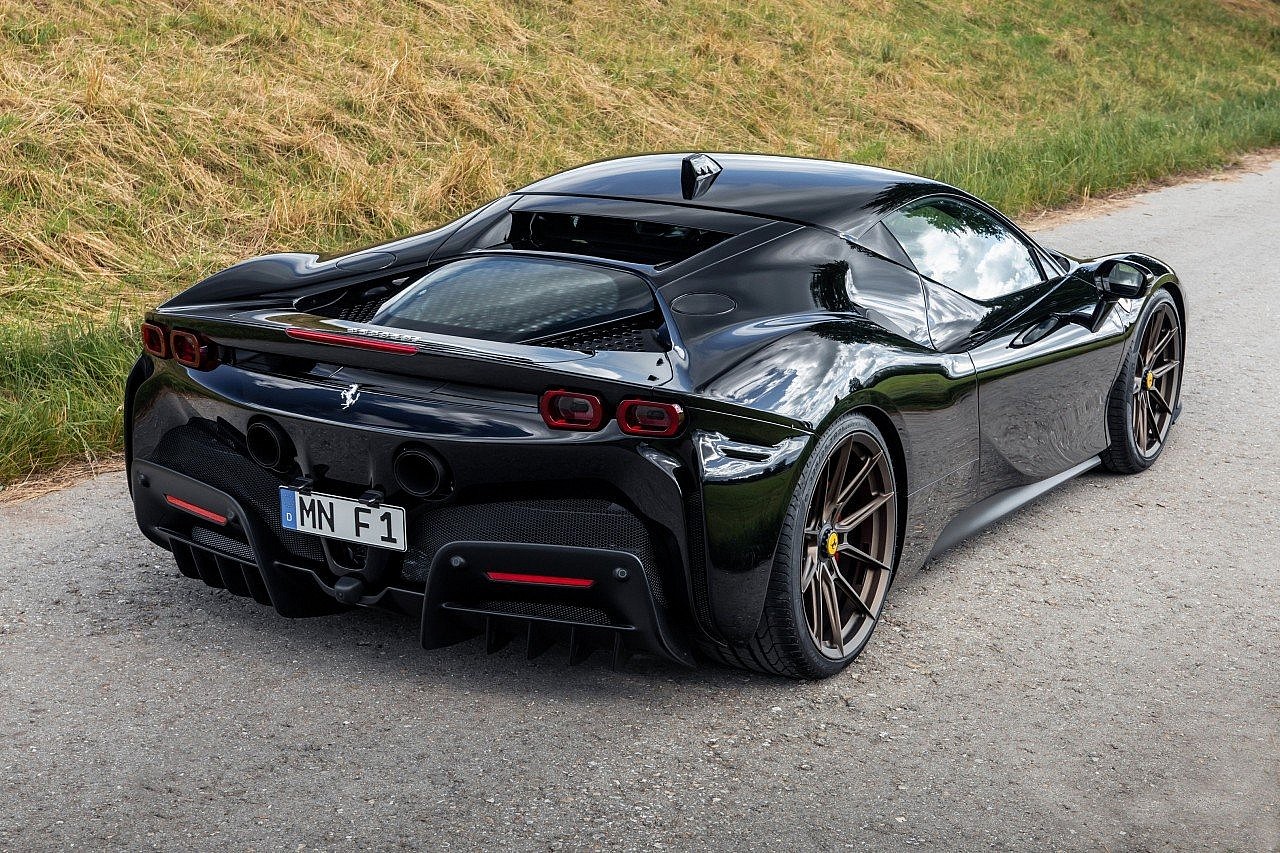 Speaking of, Novitec rendered the SF90 in all black to match its menacing performance. The giant custom rims shown here are painted with a “Bronzino” hue to create visual contrast with each wheel’s five spokes and red calipers . A suspension slam drops the front by 30mm and the rear by 25mm, giving the already low-riding exotic an even more aggressive stance.