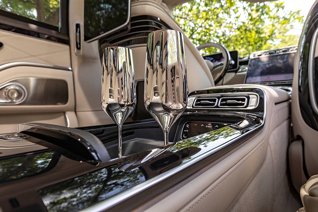 A hidden compartment reveals itself from the center console splitting the two rear seats, uncovering four cup holders: two for champagne flutes ($3,200 a pair) and two for regular cups (not included). And they’ve got their own climate controls. Press a button and the cup holders will turn either red or blue, depending whether you want to cool or heat your drink. There are also USB chargers and climate controls for the cabin, set above the cup holders.