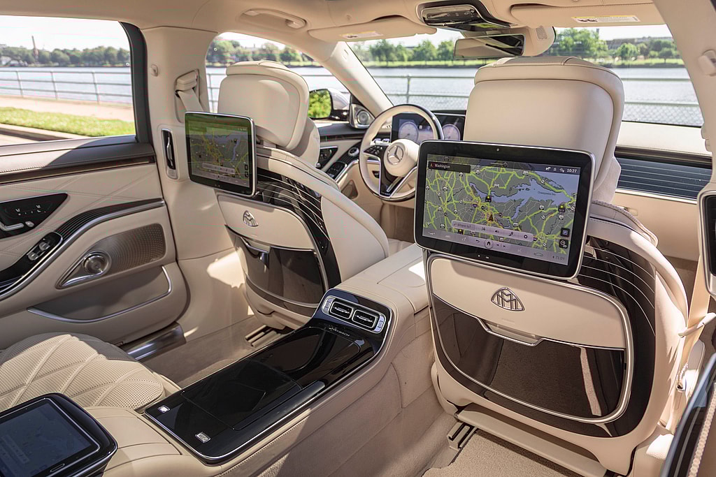 On the front, the rather compact front grille of the S-Class is replaced by a behemoth radiator-style grille. Thanks to its seven-inch extended wheelbase, rear ¨comfort¨ doors are larger as well. They are electronically opened and closed, either via touching the pop-out door handles, an interior roof switch, or the infotainment touchscreen.