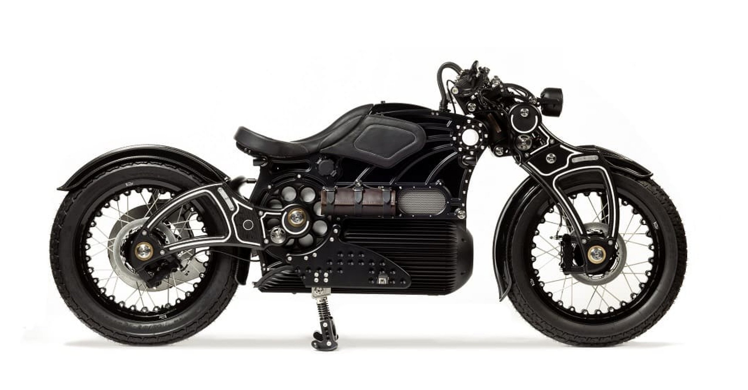 A proprietary axial motor is centered along the horizontal and vertical axis of the chassis, with a hefty hardened-steel drive shaft attached—Curtiss Motorcycles claims the system provides “the most balanced operation ever created on two wheels.”