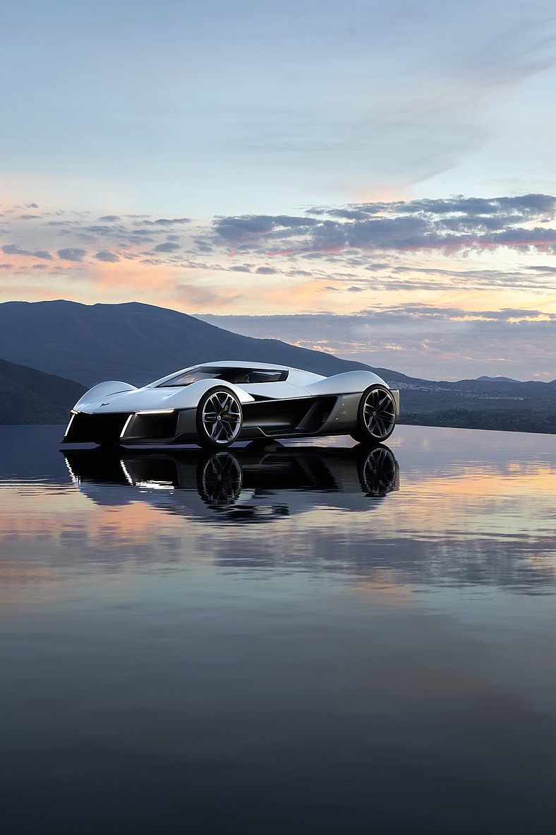 The exterior design includes a distinctive division between the upper and lower halves of the vehicle. The upper half captures the Corvette’s classic design elements, but in a futuristic manner—among them the aforementioned “split window” reinterpretation, a feature that adds value in historic collector-grade Corvette examples and is also present on the new C8 ZR1.