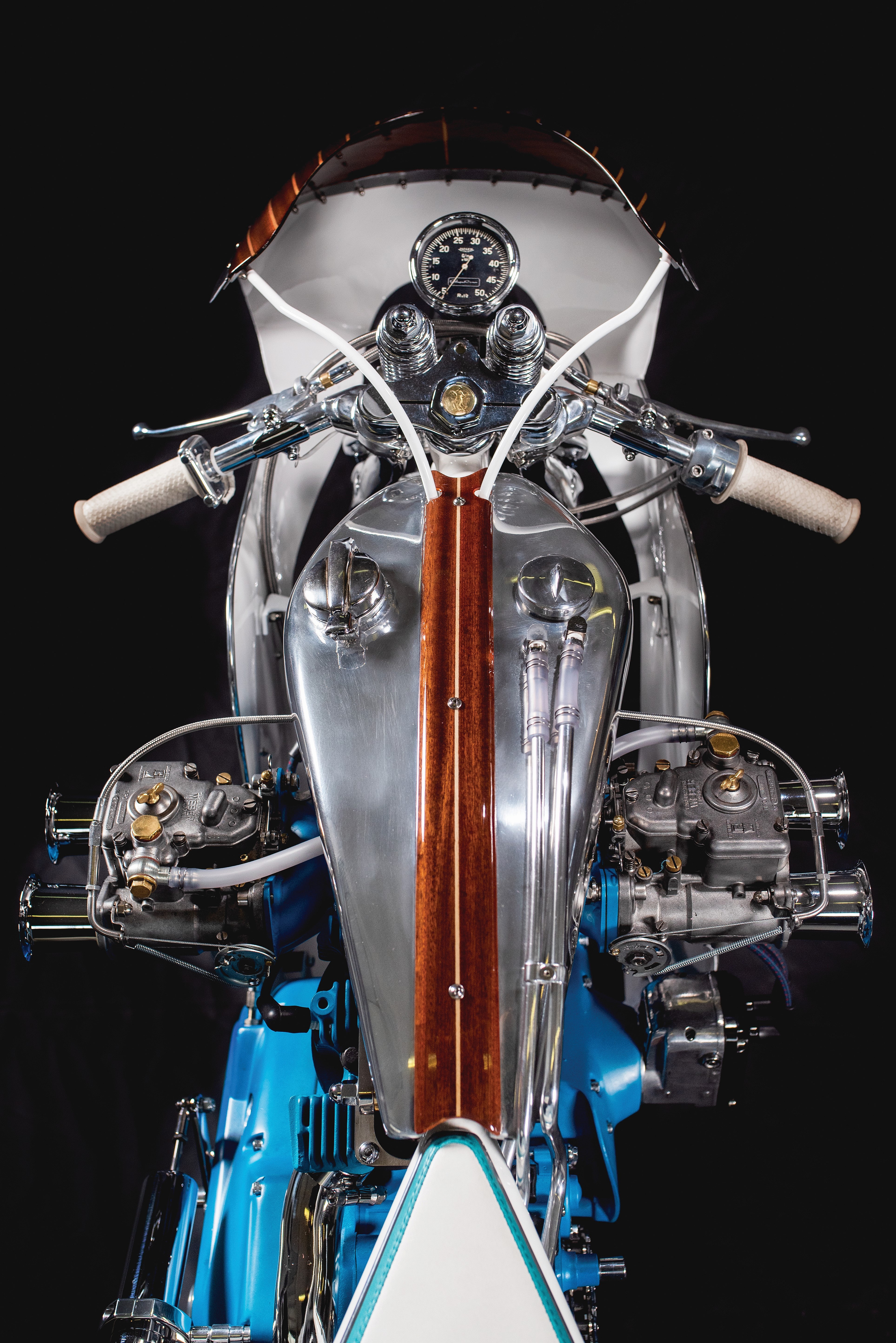 Andrea and I are great friends, we share the same passion for motorcycles, speed, beer… and women. For the realization of the bodywork we spent about two months last winter beating aluminum—the whole body and the tank are hammered by hand in foil of aluminum. Finally the fairing and tank were ready, but in my vision it must be made of mahogany on the side just like on the actual Aquaramas. So I called Davide Aresi, who is also a great friend and a wood-master. He cut, steam-bent and covered in 100% real mahogany the aluminum body. Then we spread some layers of transparent varnish as on the real boats.