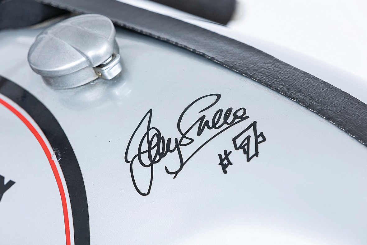 The very last bike the great Barry Sheene rode to victory was recently auctioned by Bonhams in the UK, his 2001 FWD Manx Norton 500cc Racing Motorcycle ‘FW02’, which was specially prepared for the two-time World Champion and took him to first place in the Lennox Cup motorcycle event at the 2002 Goodwood Revival Meeting. If ever there were a case of two icons working together in perfect harmony, this was it.