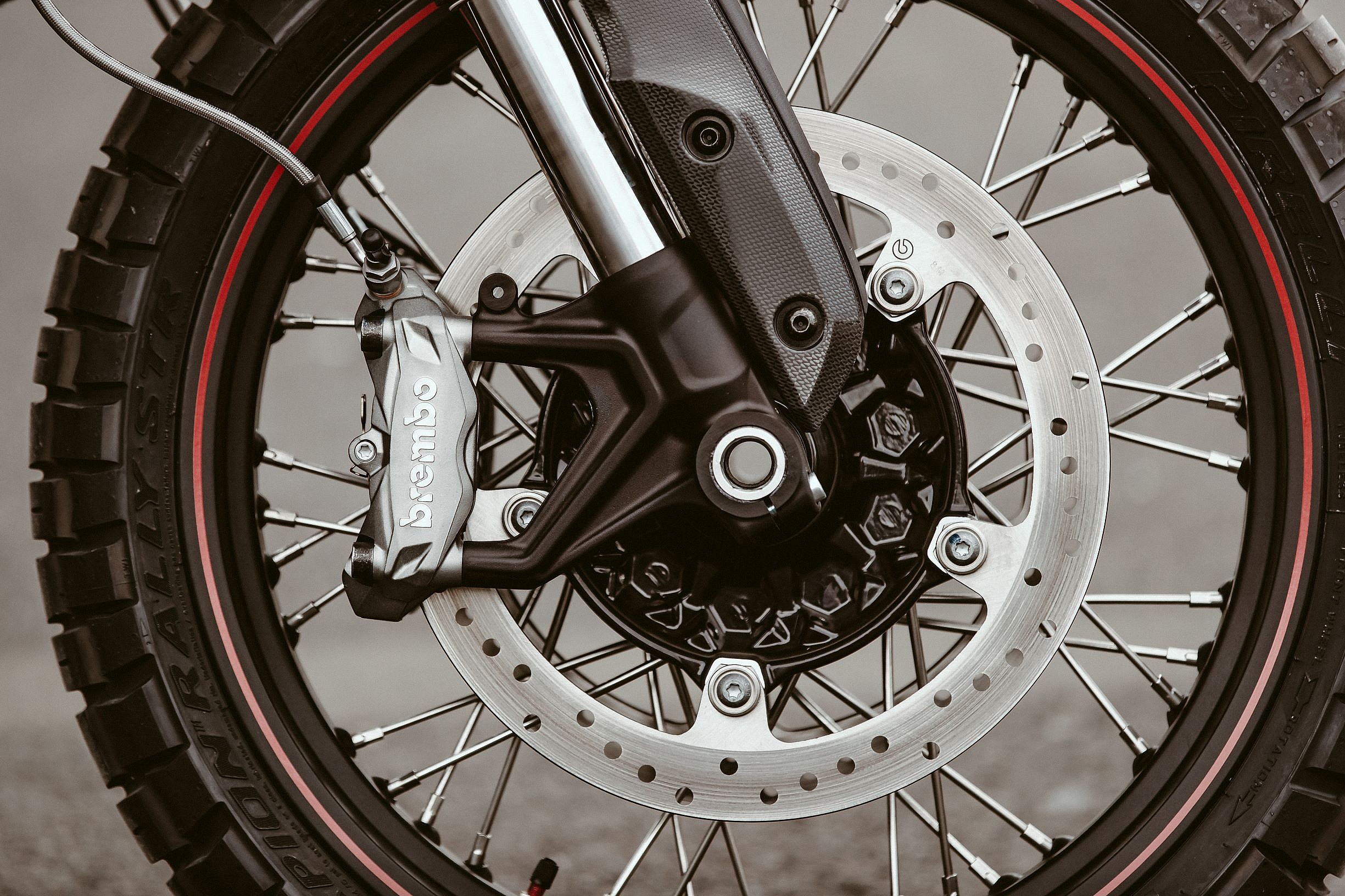 Instead of blacked-out wheels with chunky spokes, the Rally gets aluminium wire wheels accented by a red pinstripe with stainless steel spokes. The rims are wrapped in Pirelli Scorpion Rally STR tires, which are suited to urban riding or light-duty off-road exploring.