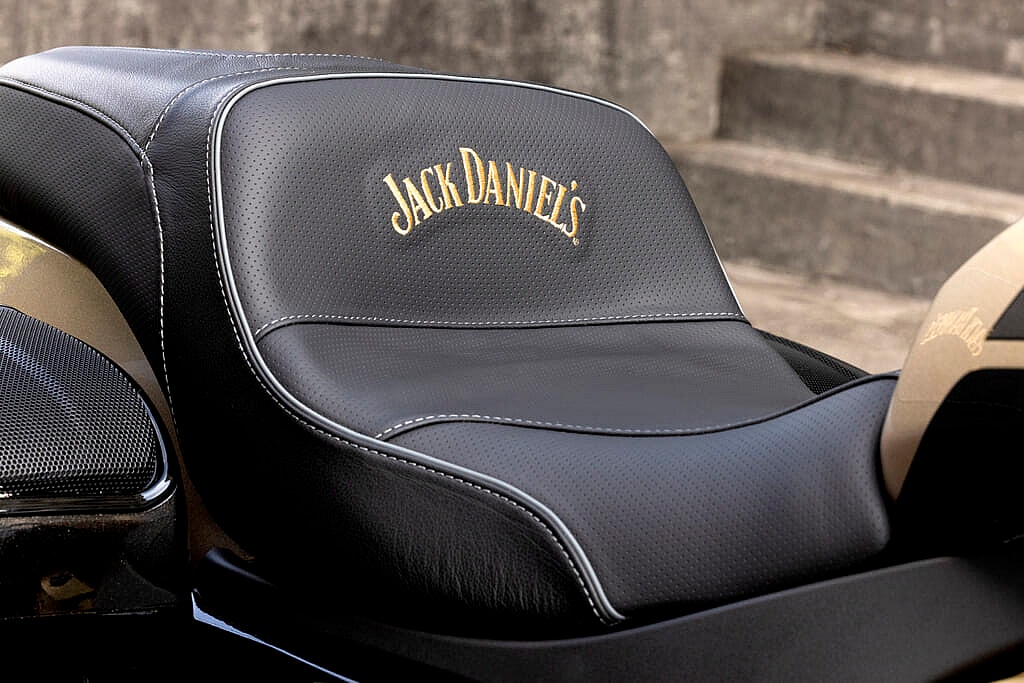A “Rye Metallic” paint coat with gold and green accents celebrate the OG Jack Daniel’s 70-percent rye grain bill, creating a two-tone effect on the bags, tank, hefty front fairing and fender.