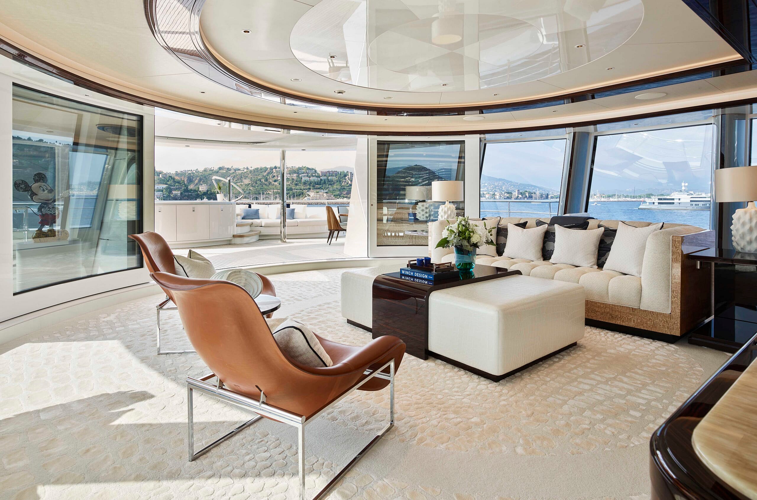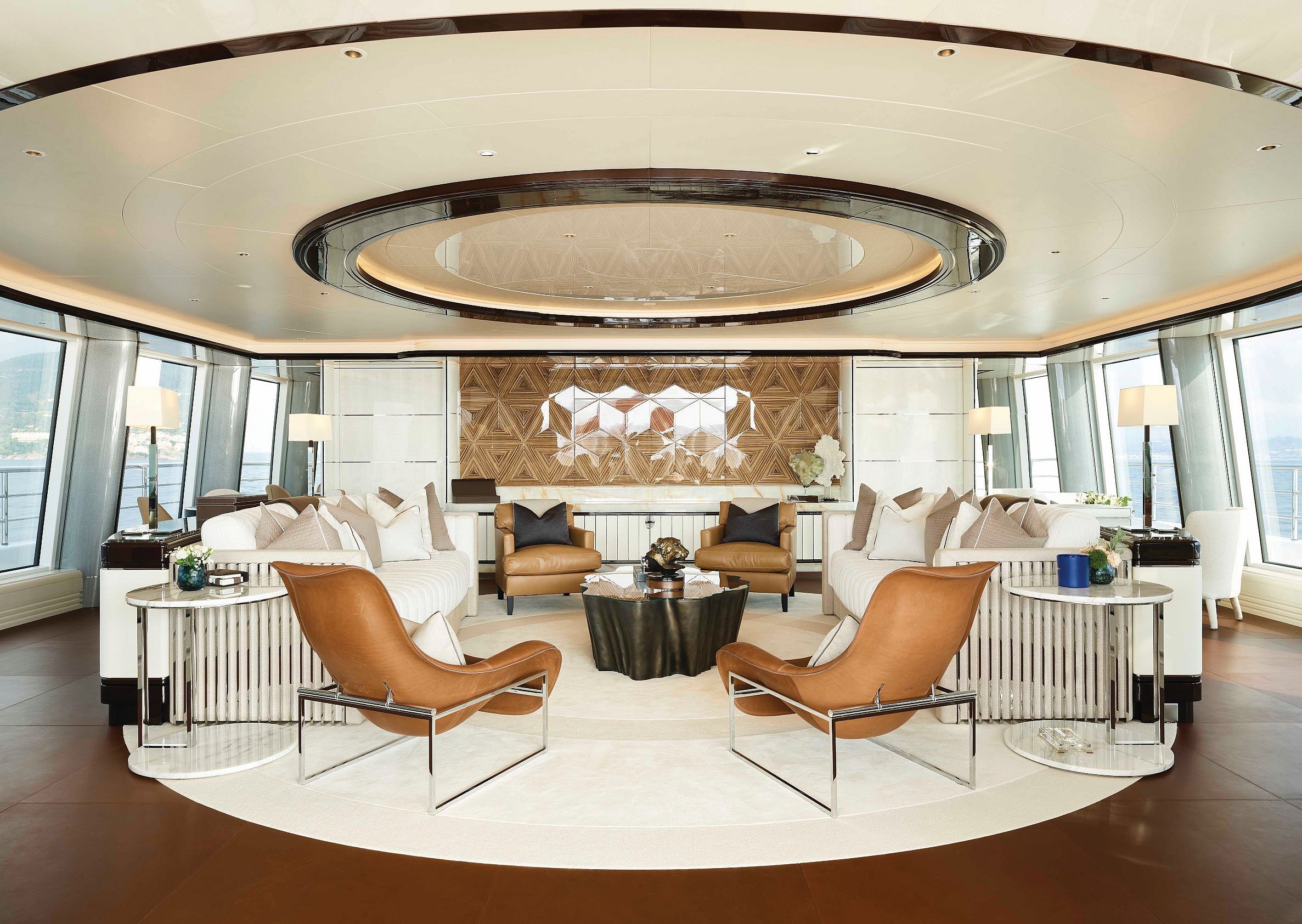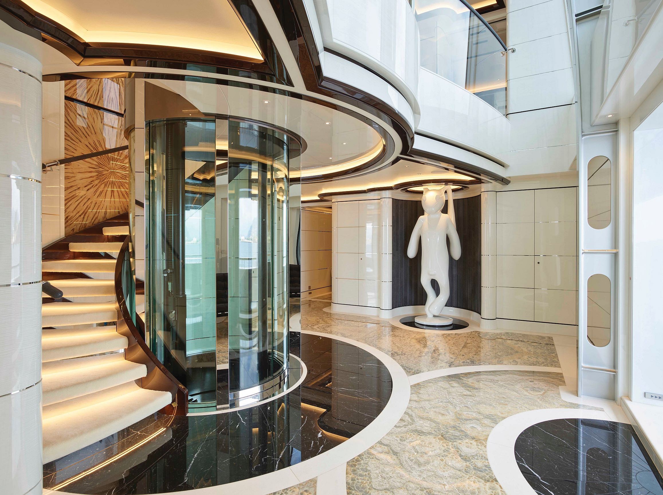 The new Excellence can accommodate 12 guests in seven cabins along with a crew of 20. The sophisticated style of Winch’s interiors, flooded with natural light thanks to a triple-height glass atrium, belies the yacht’s power; despite its size it is capable of a maximum speed 16.8 knots with a cruising speed of 13 knots. The owner’s suite, complete with a private deck with a Jacuzzi and sun loungers as well as a separate terrace, is especially impressive with floor-to-ceiling glass providing 180-degree views.