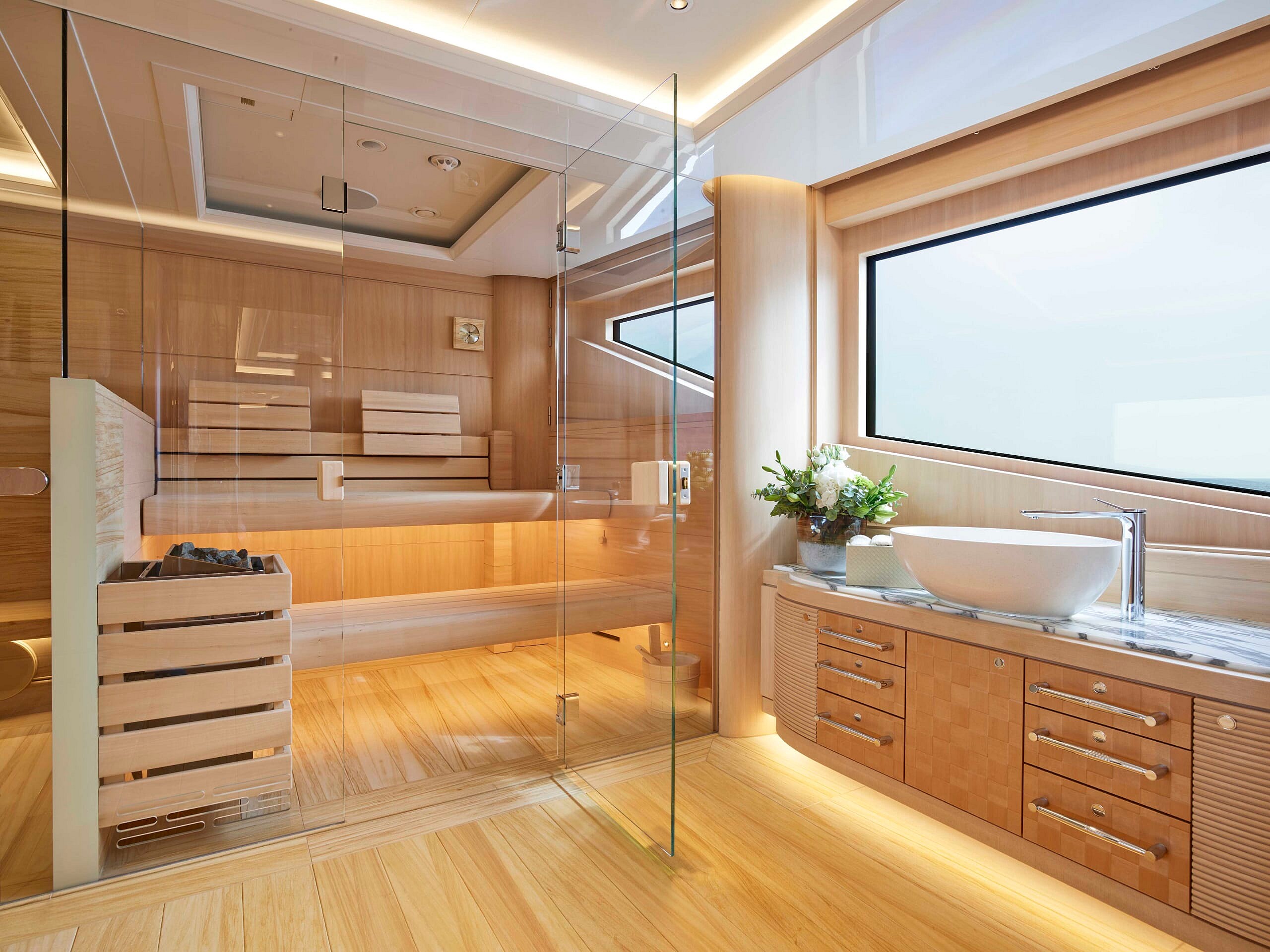There is a large swimming pool on the yacht’s main deck aft with a swim-up bar, while the sun deck features another Jacuzzi.