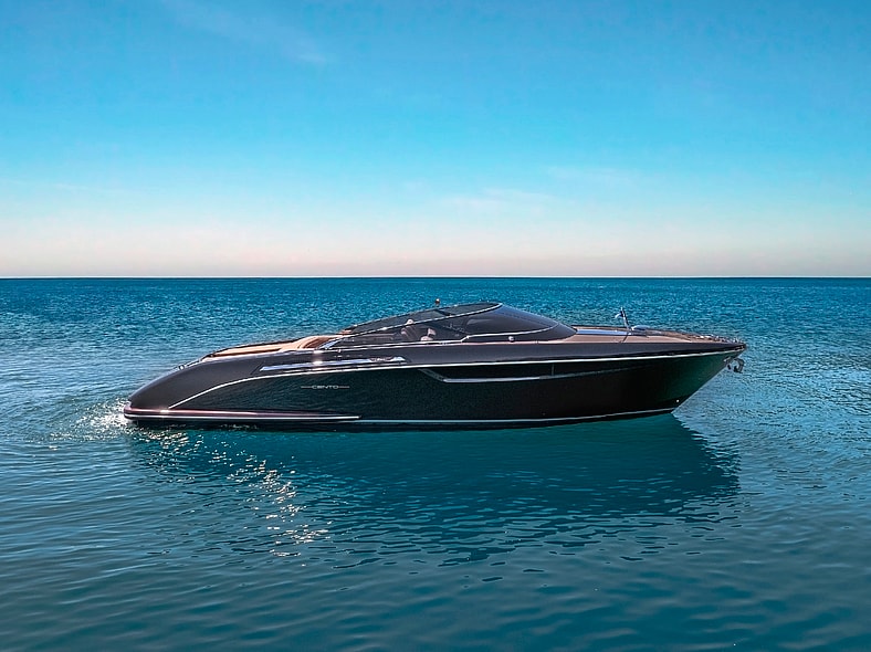 Though only announced in 2016 before the first example hit the water a year later, the Rivamare 38′ has already seen 100 units produced. This special “Cento” one-off celebrating that feat retains the core boat’s elegant-but-functional features, including the aft platform with an electro-hydraulic hatch that opens to create a beach area with chaise lounges, storage for fenders and Seabobs, and a retractable gangway. Also carried over are the electro-hydraulic bimini and large convertible dinette that transforms into a double berth. Updated features including redesigned bow skylight, widened side windows, an aft handrail integrated into the hull, and a dark new color palette distinguish the Cento from the 99 others that came before it.