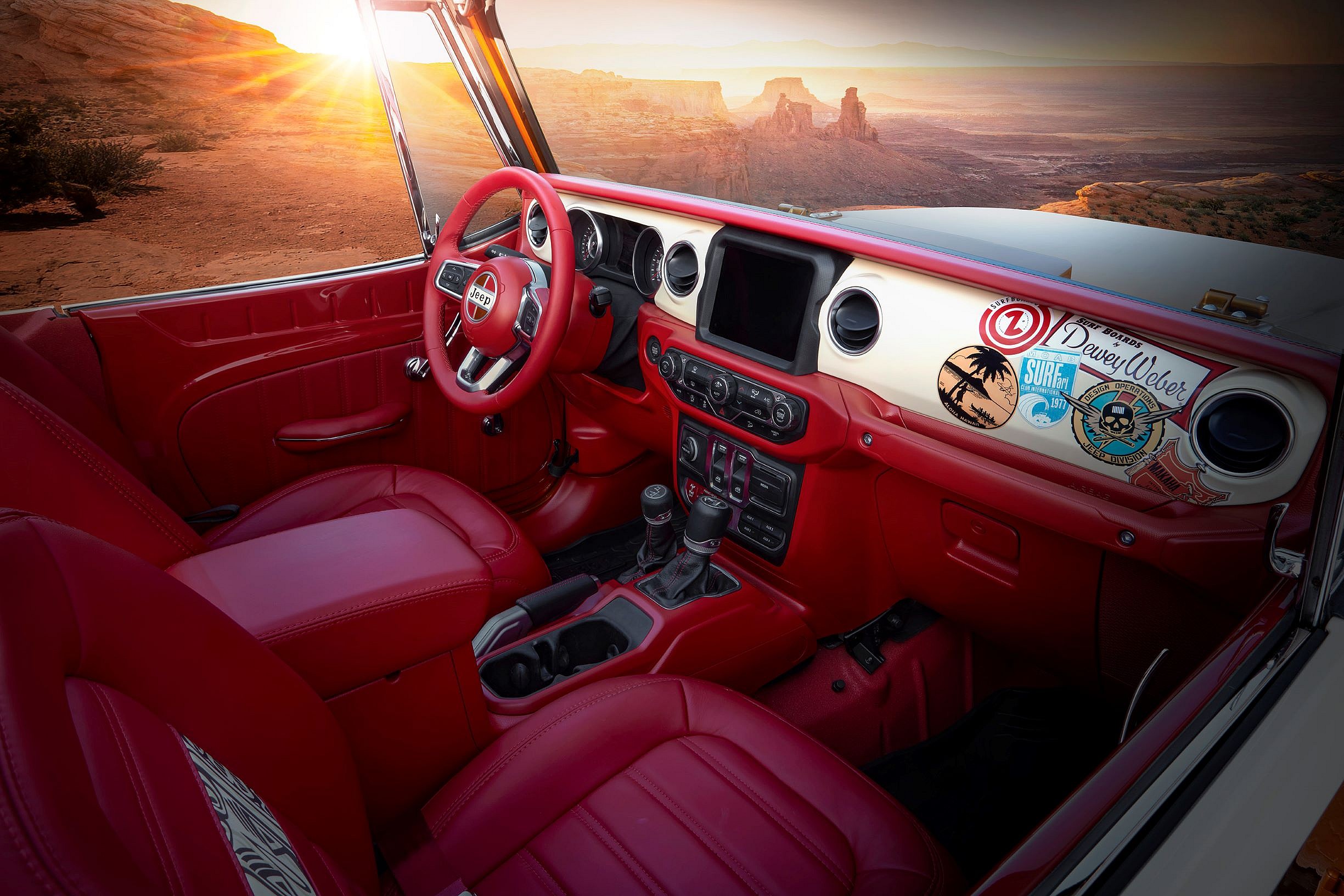 Jeepster Beach’s custom interior features low-back bucket seats trimmed in red leather. The rear seat was replaced with a chrome, four-point safety cage, and the carpets were removed to make cleaning out sand a breeze.