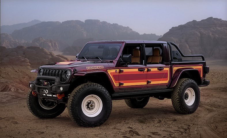 Despite the bed, the second Easter Jeep Safari concept inspired by the 1970s Honcho trim is NOT actually based on the Gladiator pickup. Instead, this is a four-door Rubicon that’s been made in to a two-door truck with a 6-foot bed, adding 12 inches to that of the standard Gladiator, all while matching the 118.4-inch wheelbase of the current-gen Jeep Wrangler.