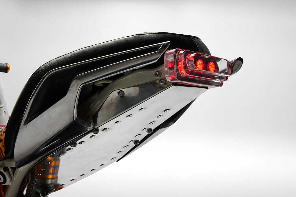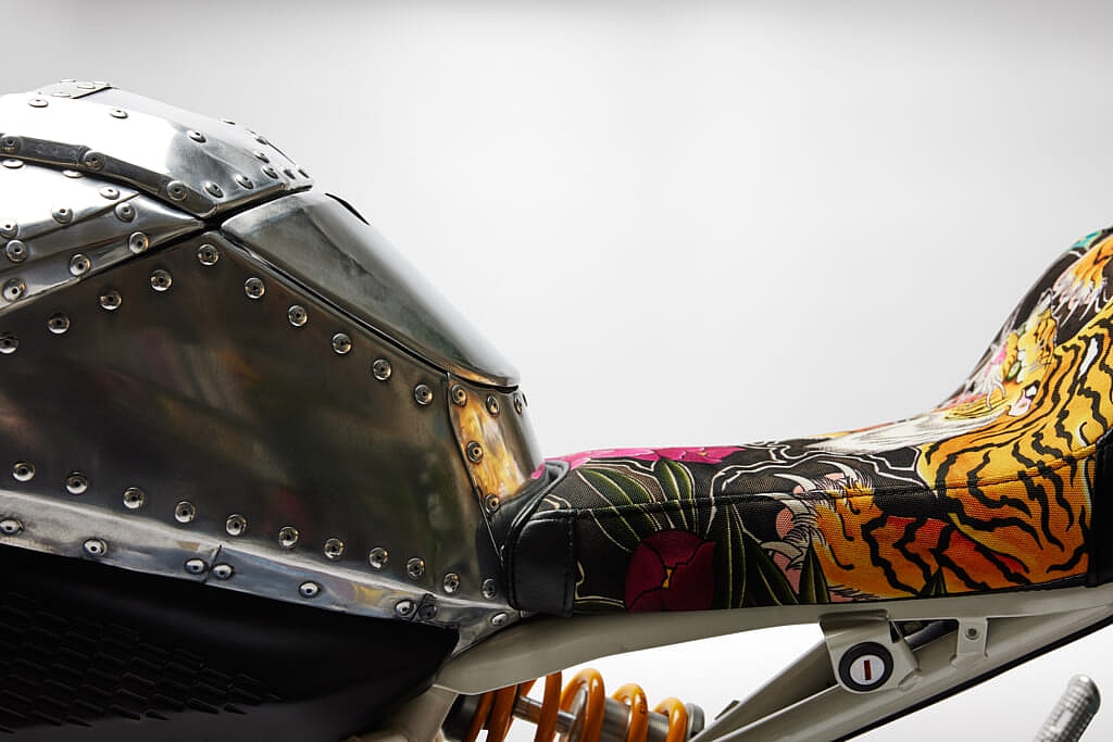 As Ride Apart reports, Hatfield and Drake added a riveted aluminum “fuel tank” inspired by WWII bombers without detracting from the SR/F’s silhouette. Behind the tank is the flashiest customization—a Tiger-embossed seat decorated in the style of classic Japanese ink by local tattoo artist Drat Diestler.