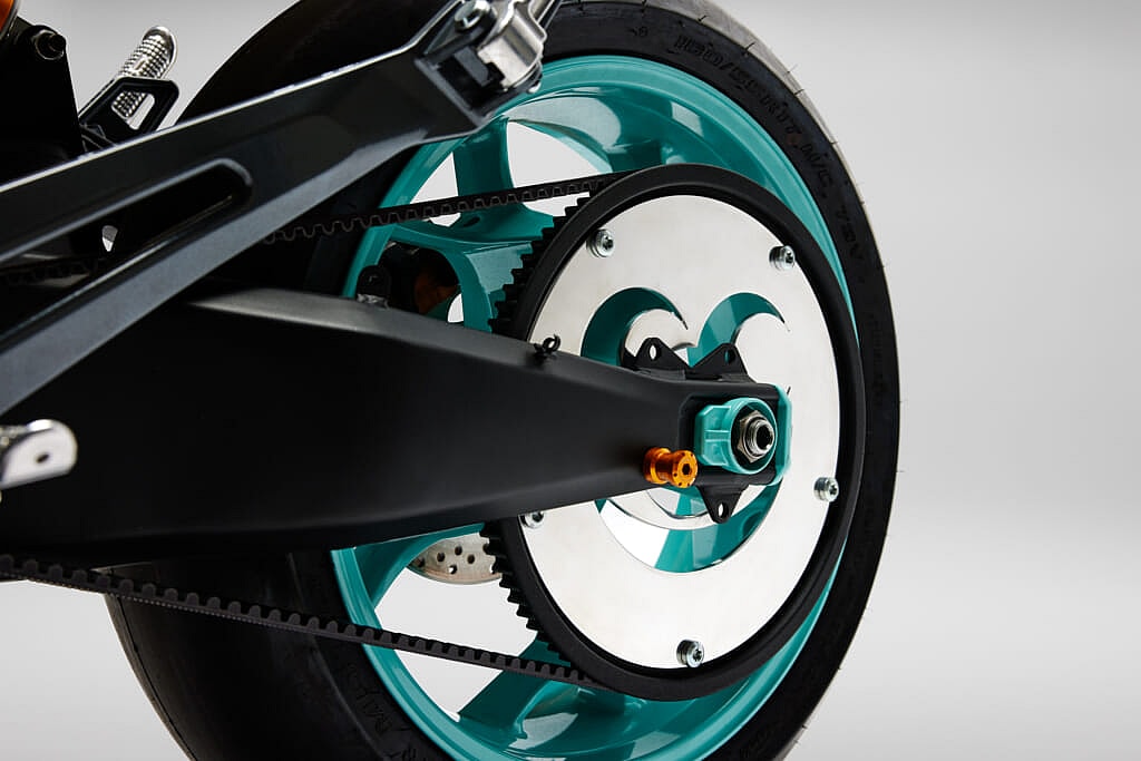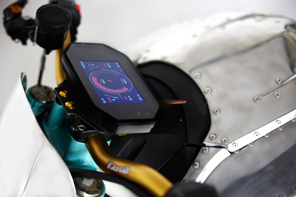 Other unique components include teal-painted rims, gold handlebar ends and bobbins, a white powder-coated frame, and a rear sprocket shaped to See See Motorcycles’ logo. As a testament to the SR/F’s core quality, the V-twin-besting electric motor, Ohlins suspension, and Brembo braking system were all retained.
