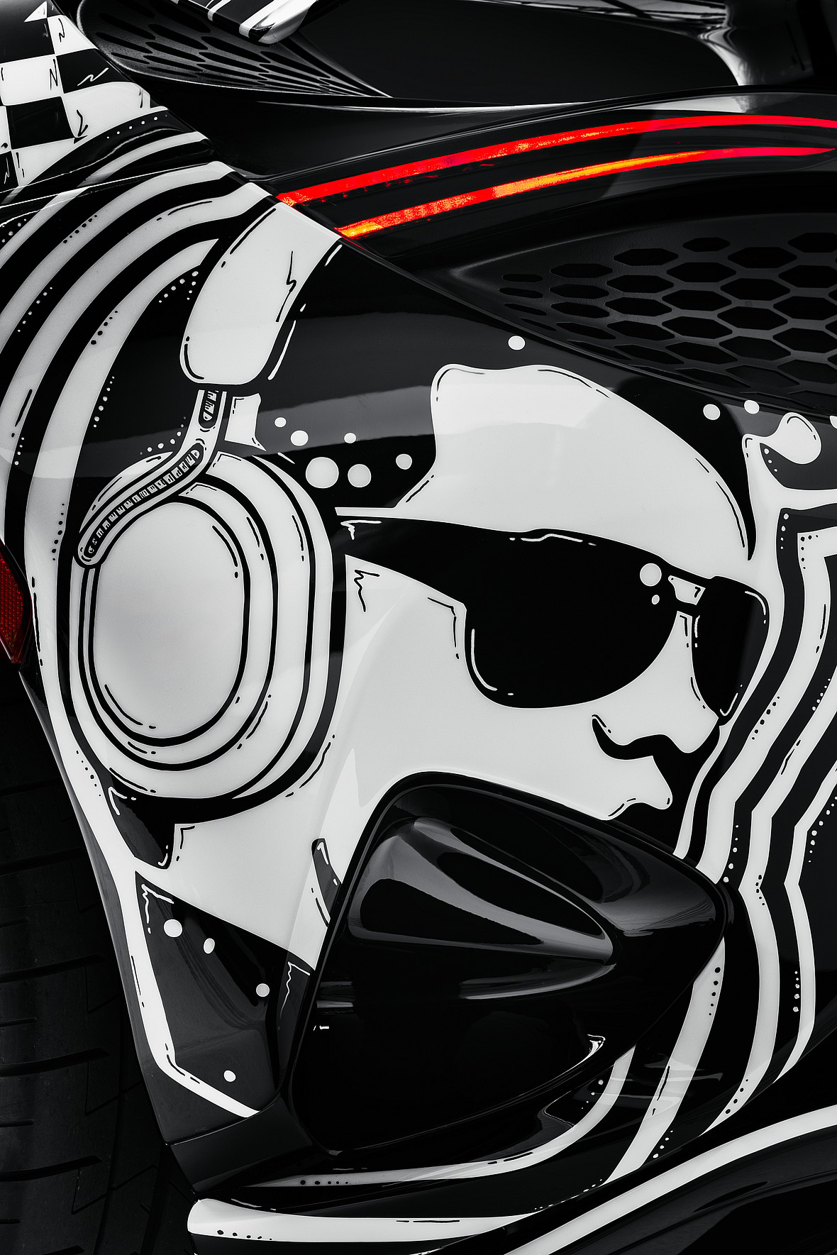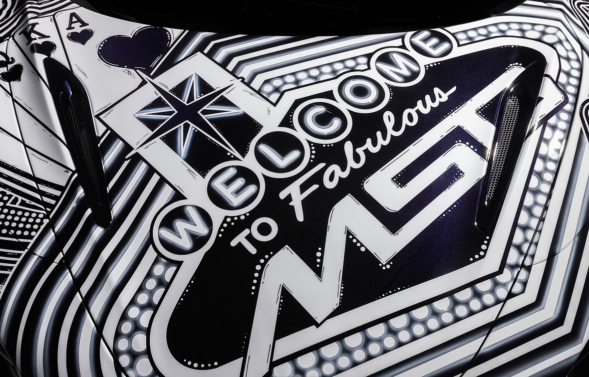 Designed by the McLaren Special Operations customization division, “Project Viva” is brimming with enough flash and pizazz to stand out on even the Vegas Strip. On a base coat of Muriwai, designers hand-painted a black “sketch in motion” livery with various nods to the GP’s electric host city, from the “750S” and McLaren logo depicted in the form of a five-card flush, a “Welcome to Fabulous MSO” sign, dice, palm trees, casino chips, and many more lively motifs.