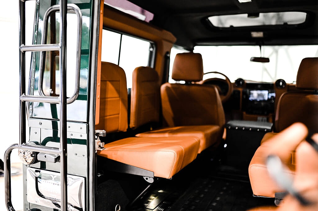 He now hand-builds Defender 90s, 110s and the occasional 130 (pickups) from the ground up, using original pre-1997 donor cars, at his 22,000-square-foot workshop, where he has 17 employees. Osprey has built more than 500 custom Defenders (just 35 per year on average) so far, and Richardet usually has around six of them in various stages of completion at any given time. They’re a mix of custom commissions and spec builds that he creates using different combos of exterior paint and interior leather, many paying homage to classic Land Rover color schemes.