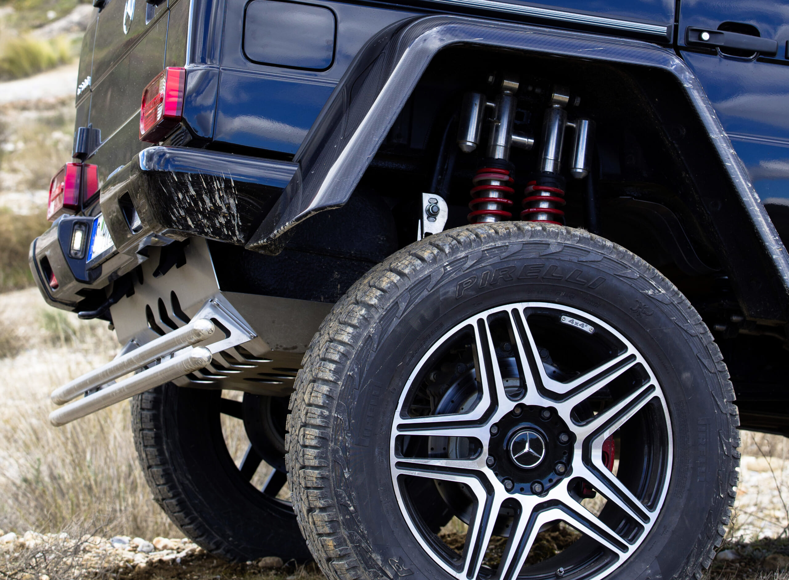 It can also climb over absurd obstacles, but we were puzzled by the very low rear bumper, which defeats the truck’s ground clearance. We suspect the work of government crash safety regulations here, to prevent trailing cars from going beneath the Mercedes in a rear-end collision.