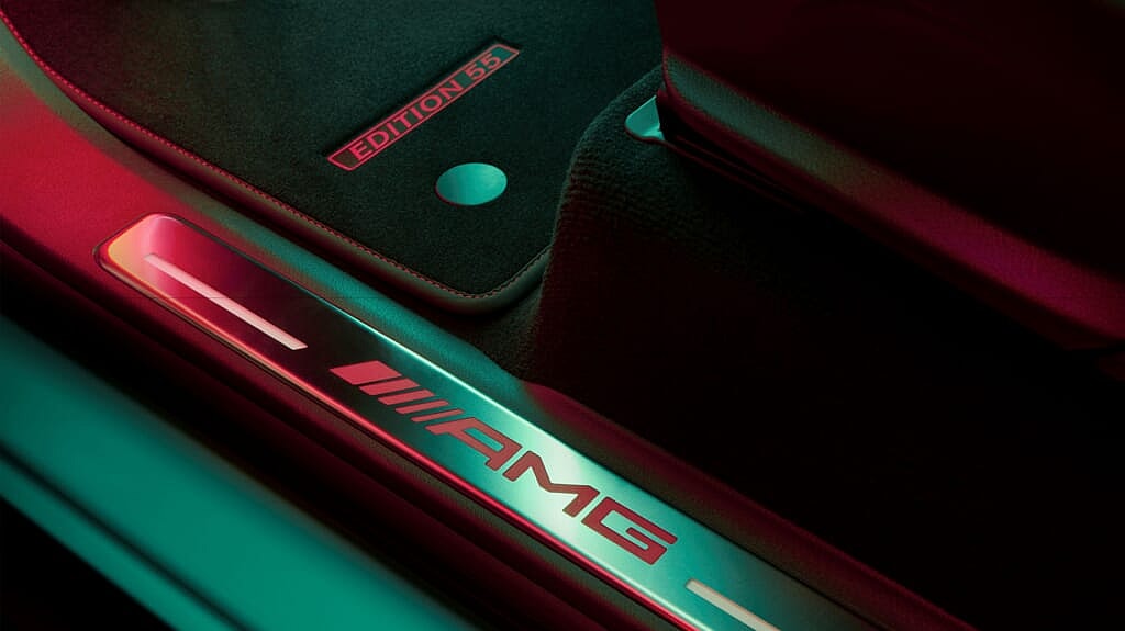 The pictured interior, however, is depicted correctly with a black and red theme and two-tone Nappa leather seats. Stainless steel door sill trims with red illuminated AMG lettering greet occupants, while black AMG floor mats made of high-quality velour feature red contrasting stitching and “Edition 55” lettering woven in red. AMG’s performance wheel is clad in microfiber and marked with a “55” badge.