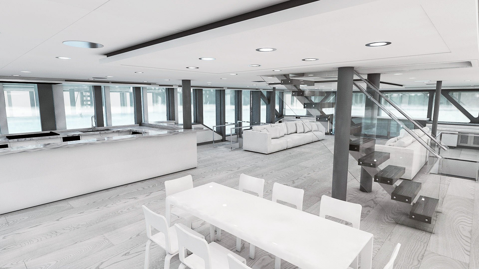Other key features include 4,230 square feet of modular interior living space featuring a a master cabin, VIP cabin, and three guest cabins, an expansive sundeck with wraparound seating and outdoor dining areas, a submersible stern platform with a 5,000-pound capacity that can be used to launch tenders and toys.