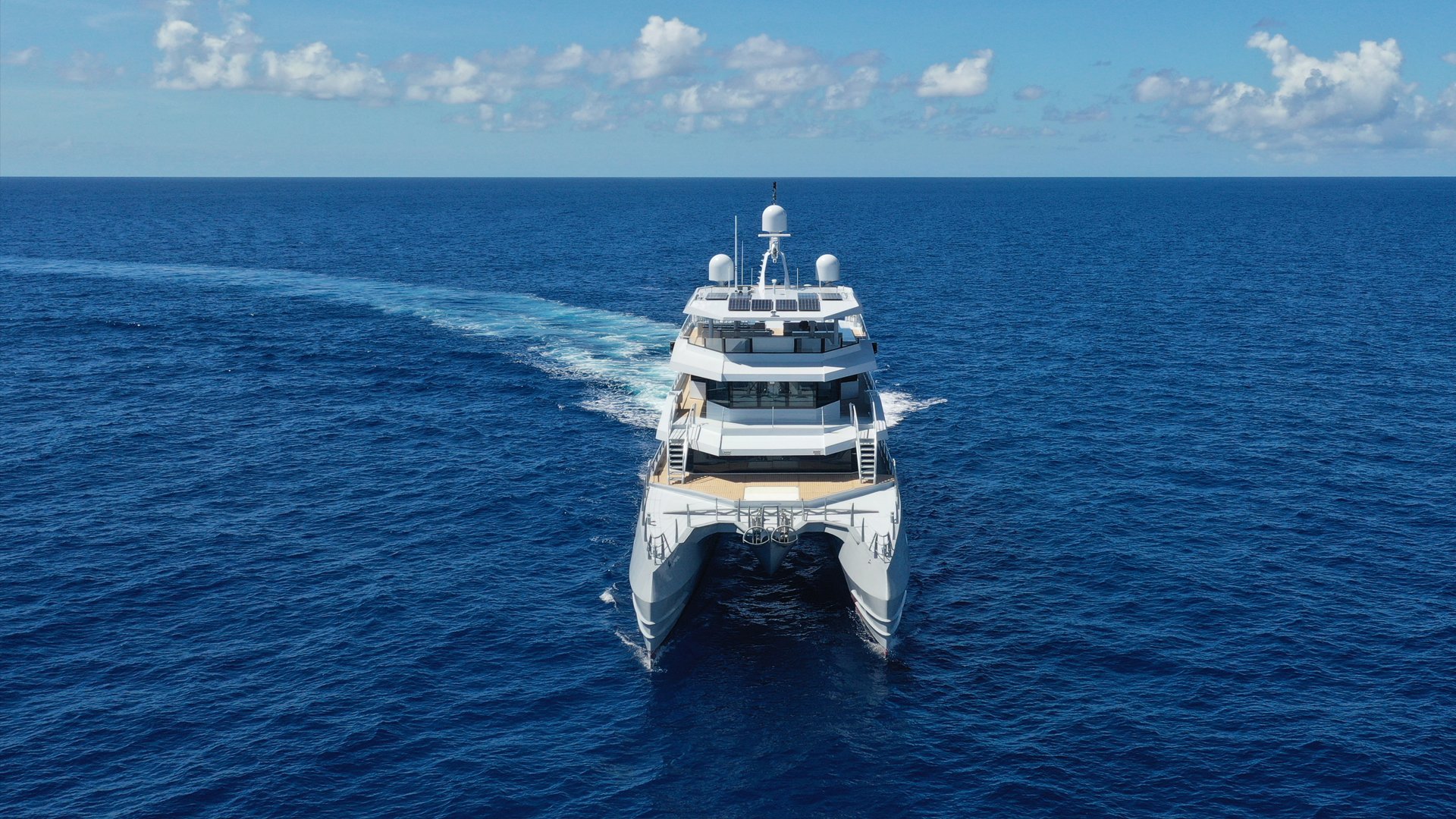 The key to its efficiency is n lightweight, all-aluminum construction and catamaran-style twin-hull, which provides approximately twice the range of a similarly sized mono-hull yacht.