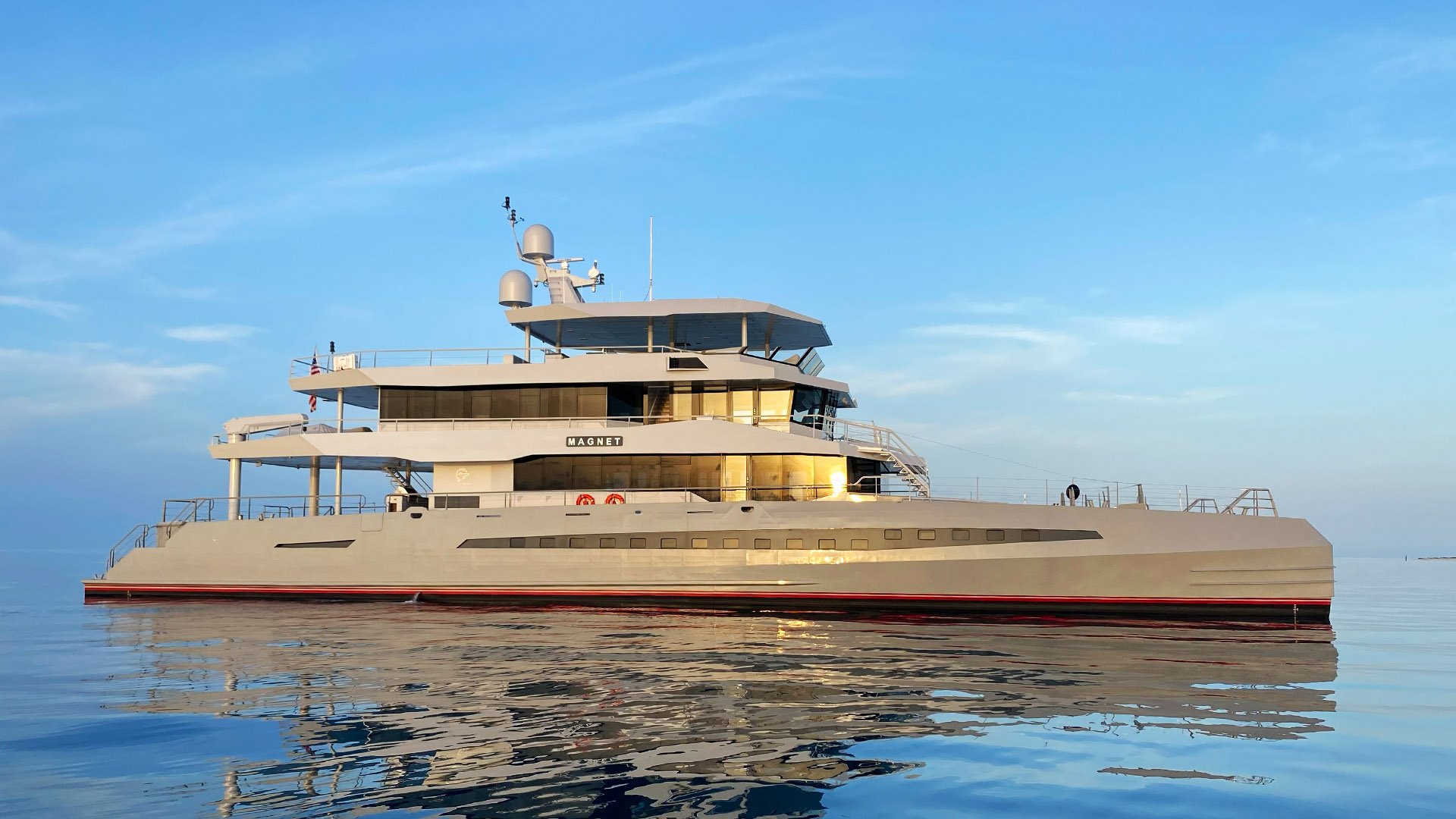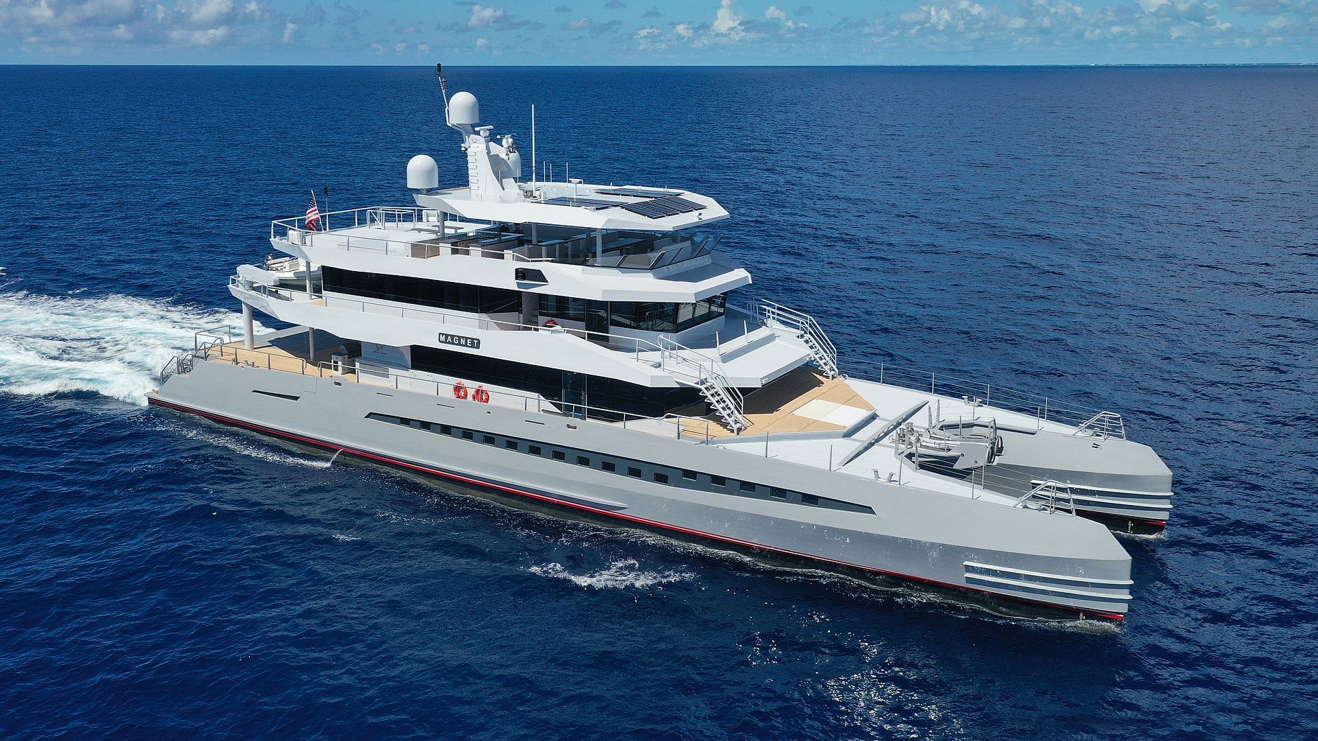 “When you’re in it, it feels like you’re in a high-rise apartment rather than a mechanical object,” Allard told RR. “One of our main disruptors is the cat hull. The other is Magnet‘s visibility—the glass-house feeling you get from the forward portion of the yacht.”