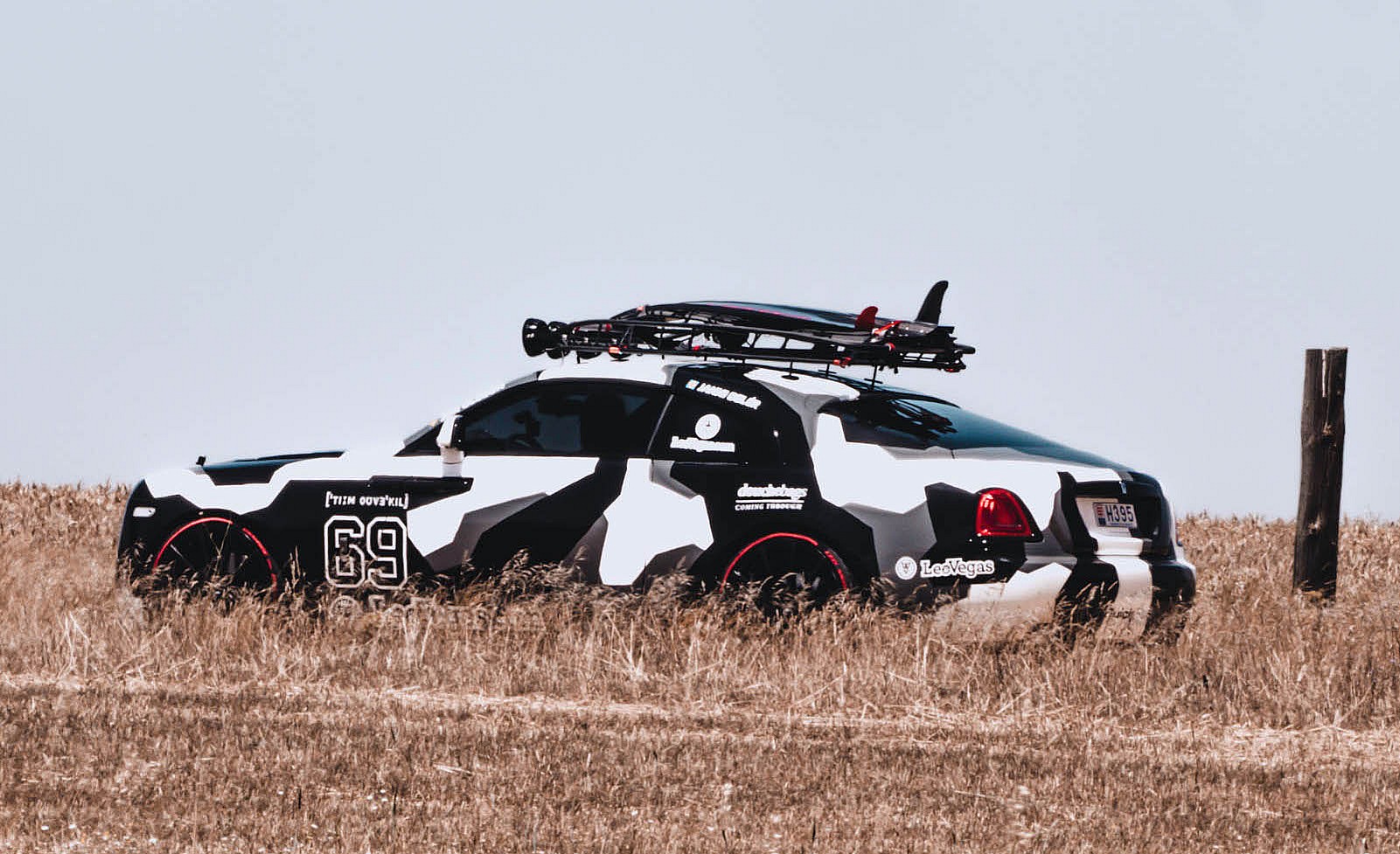 George is wrapped in a snow camouflage scheme similar to that of the Lamborghini, but in this execution it ends up looking more like a cow pattern from a Chick-fil-A commercial telling us to “Eat Mor Chikin.”