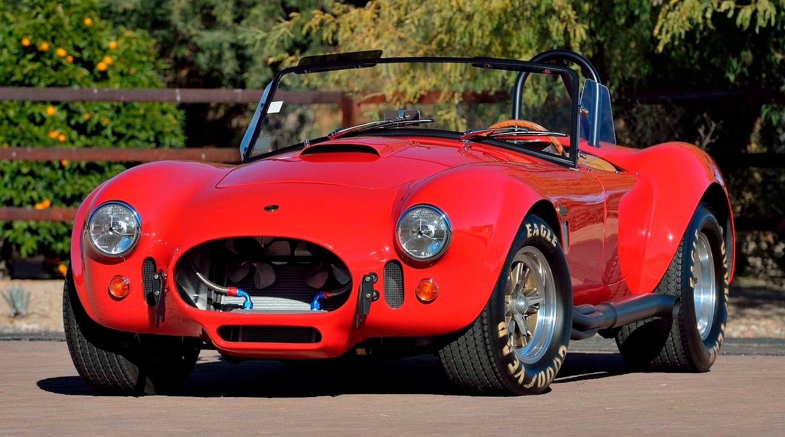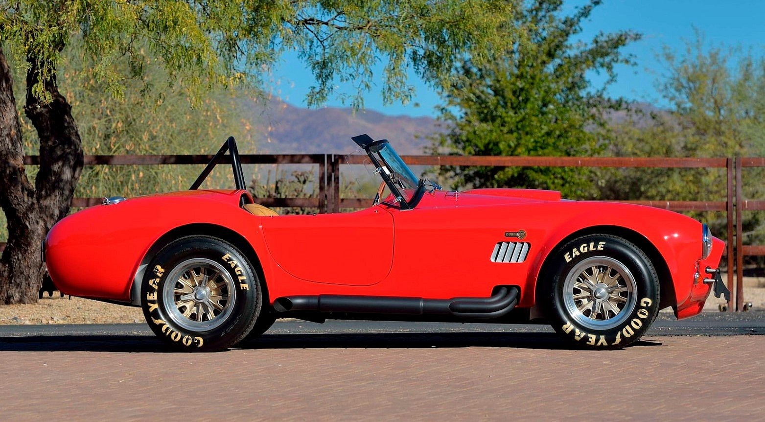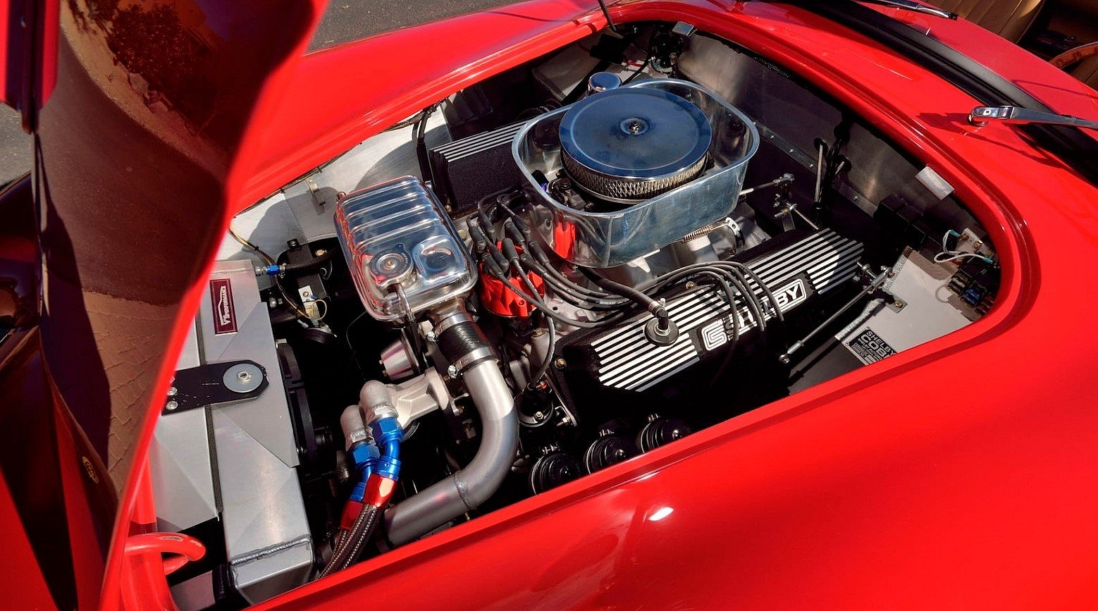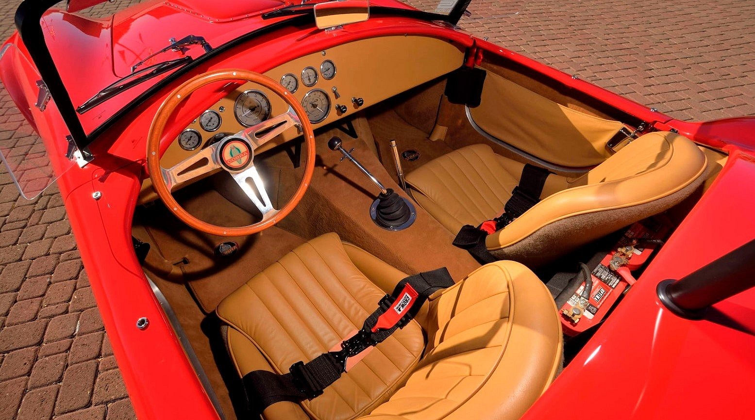 The hand-rolled aluminum body built by Britain’s AC Cars is also dressed in a Maranello’s Rossa Corsa red, presumably as another shot at Ferrari. Hi Consumption reports that the roadster runs a Shelby 427-cubic-inch (7.0) liter FE aluminum V8 that pummels 550-horsepower through a five-speed Tremec transmission. Shelby also built the differential housing and calipers, while Wilwood supplied the brakes.