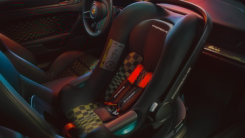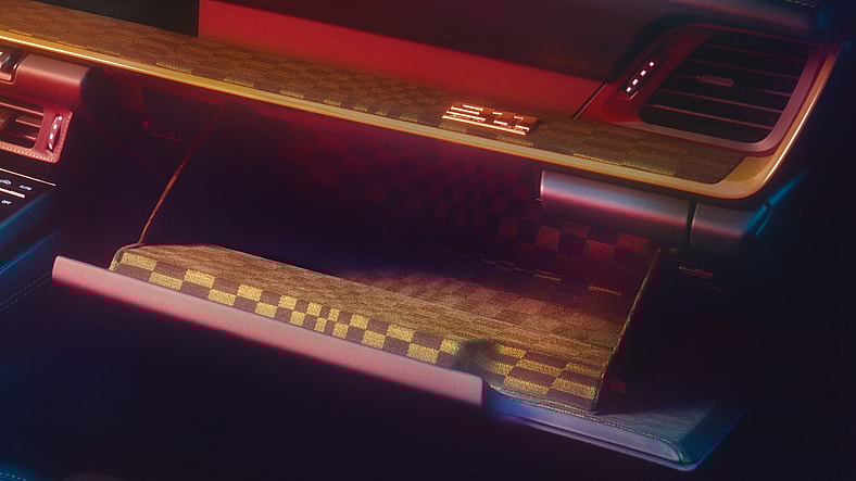 But the interior is where things really get retro. Following the corduroy and Pepita patterns of its Heritage Design predecessors, the Spirit 70 embraces a black and Olive Neo Pasha pattern for the seat centers and other interior elements. The Pasha pattern extends to the 18-way Sport Seats Plus centers, door panel inserts, glove compartment lining, and even a child’s car seat. Pasha inlays for the seat backrests and dashboard trim are available as no-cost options, and a reversible front trunk mat in the same groovy pattern is standard.