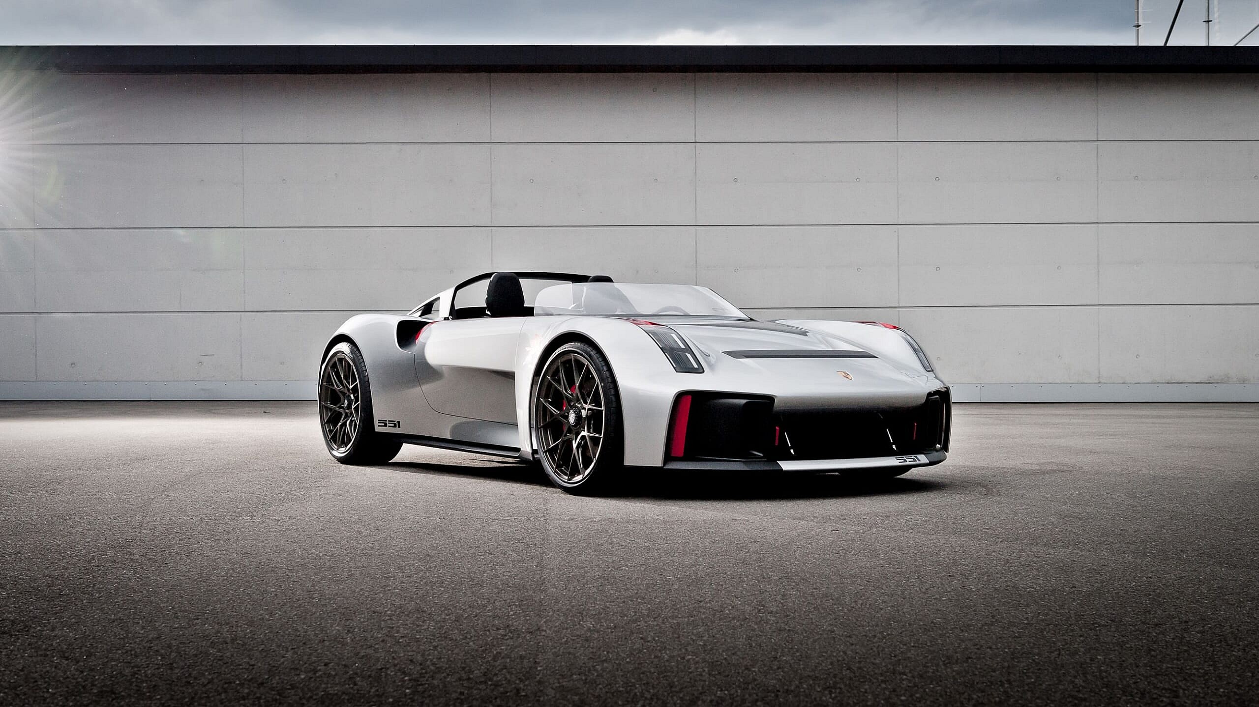 The Vision Spyder, a 1:1 hard model, is a throwback to the 1954 Porsche 550 RS Spyder with a sparse cockpit, radiator grilles over the mid engine, rear fins and a flat-lined silhouette. Porsche writes that the roadster was “intended to further develop the design identity of Porsche and provide a pool of ideas for future details,” including an aesthetically pleasing roll bar.