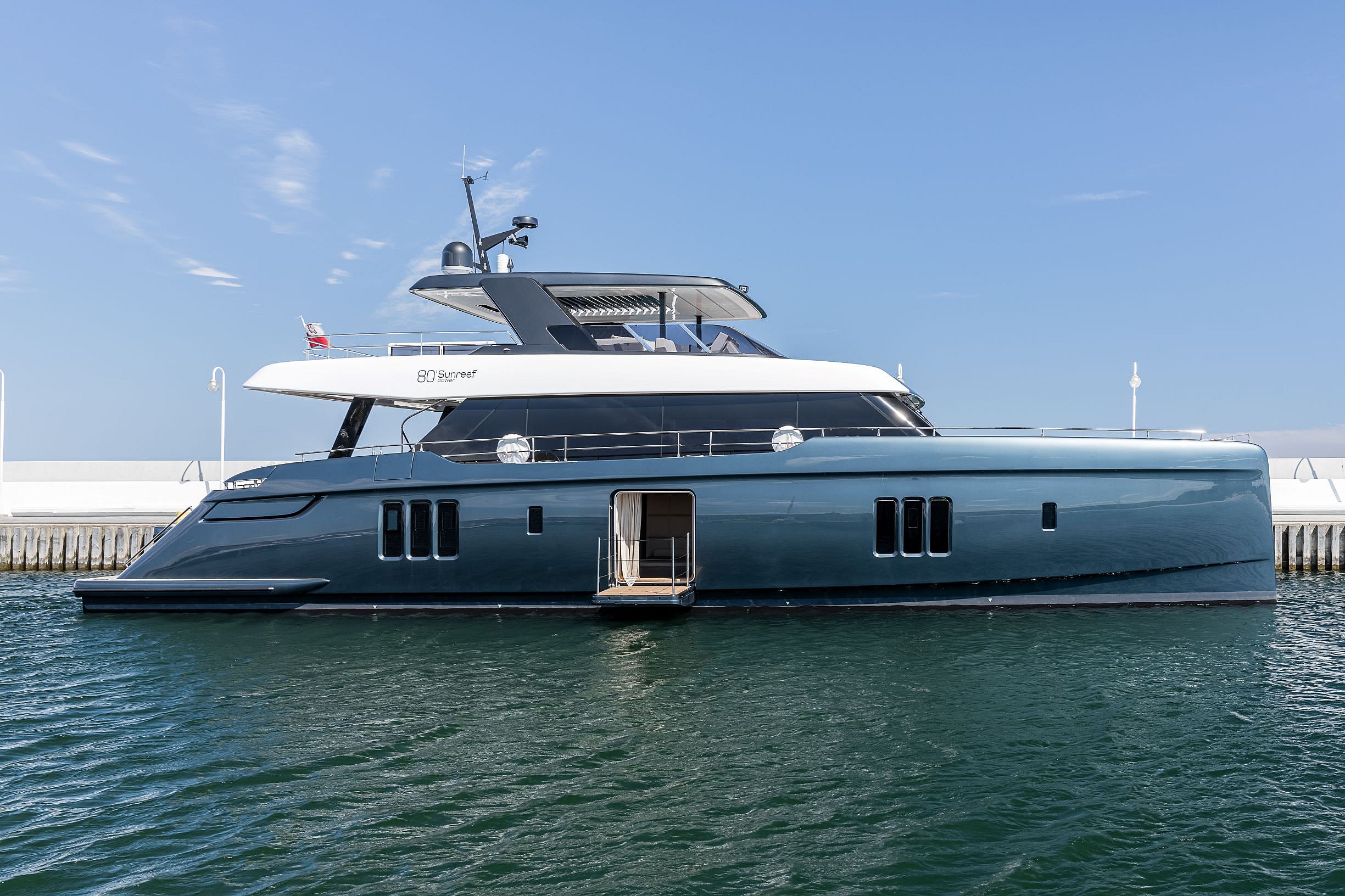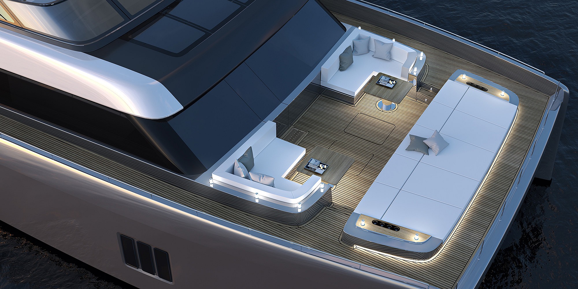 Measuring nearly 80 feet long and loaded with the 3,875 square-feet of living space, the multi-hulled composite vessel boasts contemporary-style touches including stainless steel portlights, teak sole decks, raised bulwarks and subtle ambient lighting. Power comes courtesy of dual 1,200-hp engines.