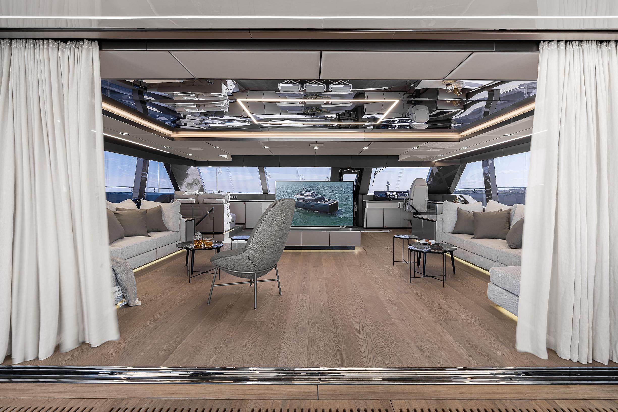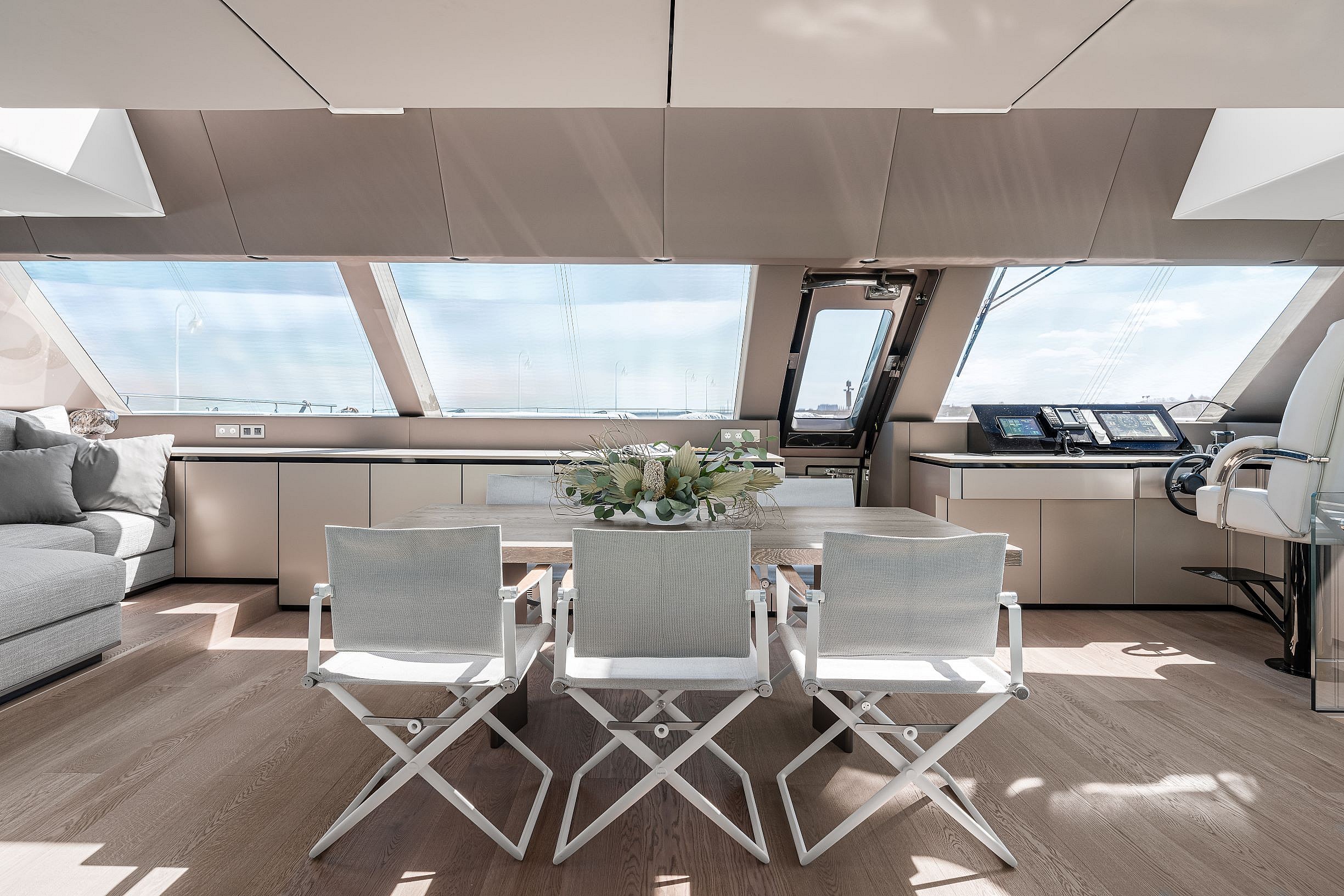 The yacht has fully personalized interiors, including an impressive main deck saloon with access to the front terrace, an owner’s suite with an opening side balcony and luxurious guest cabins with en-suite bathrooms.
