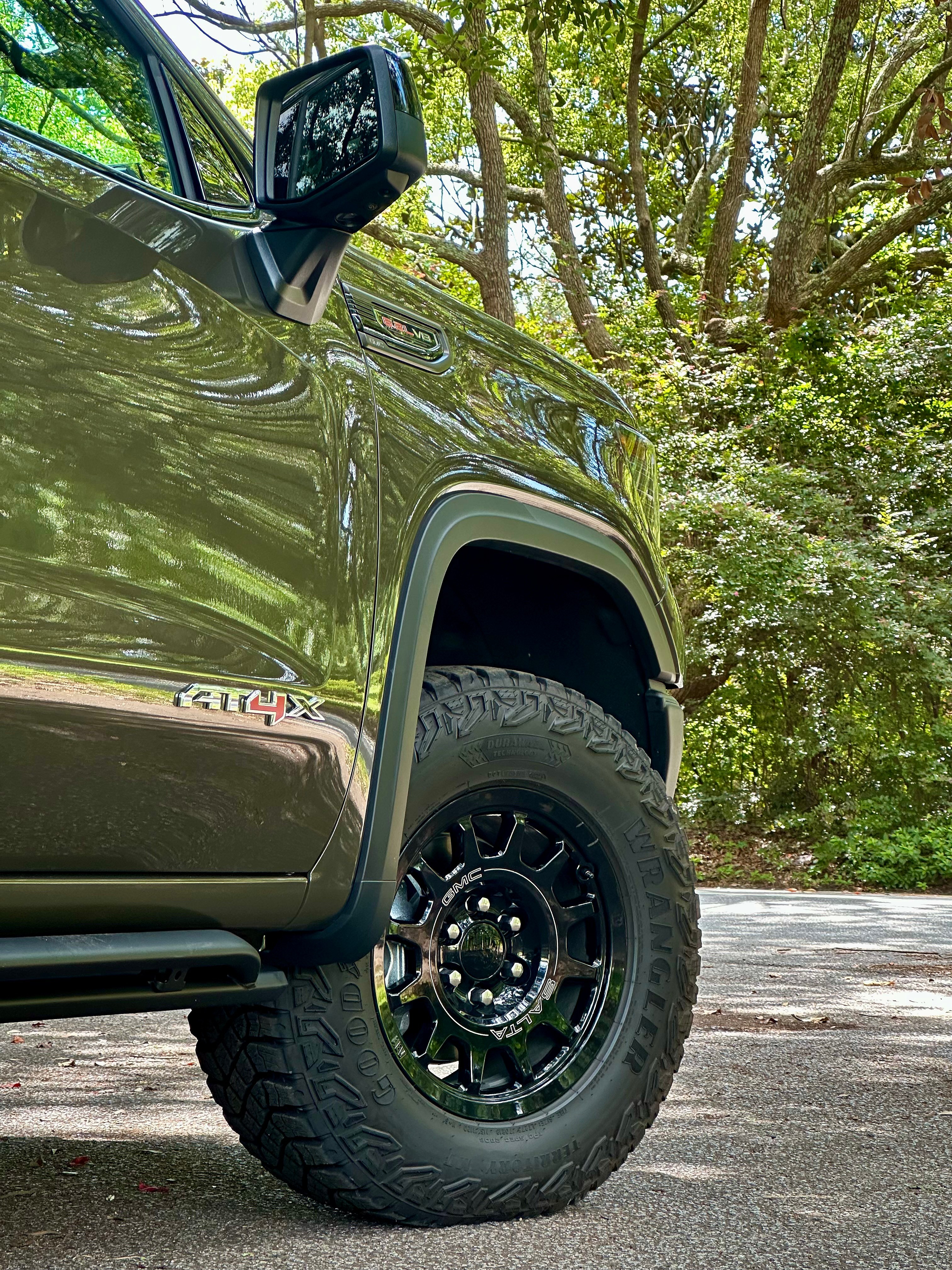 My opinion of the exterior comes with a disclaimer that I’m biased by the beauty of the Deep Bronze Metallic model I tested. It looks like more of a moss green, with a perfect blend of ruggedness and beauty. Subtle two-tone touches of black trim, glossy black aluminum wheels and pops of red in the badges are perfect understated accents. When you add the steel bumpers, skid plates, and the two-inch lift, it makes a clear statement that this is not your average full-sized truck.