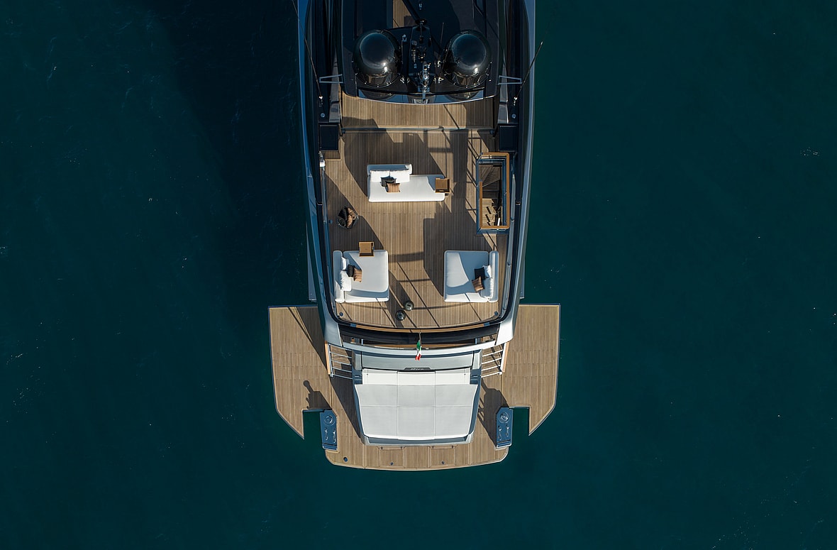 The new Riva 112′ Dolcevita Super, an evolution of the brand’s highly acclaimed 110-foot flybridge yacht, shares that DNA in name first—there’s no shipbuilder that more aptly incarnates the sweet life more. And though the new ship dwarfs the brand’s legendary runabouts, stylish travels near the waterline are had easily and immediately upon boarding the 112′ Dolcevita Super, where guests are greeted by a massive 377-square-foot beach club, located on the water’s edge. Like the Riva 82’ Diva, two bulwarks swing out to form side terraces, increasing the vessel’s total surface area to up to 635 square feet. This area also houses a garage for a Williams 565 tender and a Sea-Doo jet ski beneath an extra-large sun sofa.