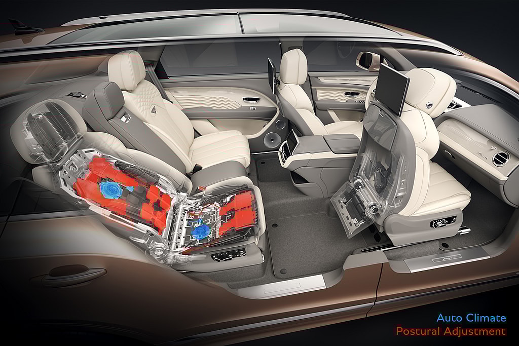 Tucked into the menus are options to control lighting, including Bentley’s latest LED tech sewn directly into the plush leather door panels. Then there are the auto-climate seat controls that use embedded sensors to read your body temp and adjust seat heating or cooling accordingly.