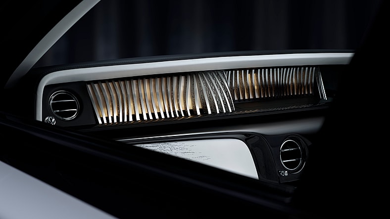 According to Rolls-Royce, the focal point of the entire vehicle is the Anthology Gallery, a dramatic composition made of 50 3D-printed, vertically brushed aluminum “fins” interlaced like pages of a book. Each fin is composed of sculpted letters that can be read from both sides and form praiseful quotes written throughout the last century. The aluminum fins are surrounded by the most intricate woodwork ever created for a Rolls-Royce, featuring various scenes crafted using 3D marquetry, laser etching, 3D ink layering and gold-leafing. These depictions are odes to momentous locations and occasions in Rolls-Royce’s history, including the Phantom’s 4,500-mile journey across Australia and Sir Henry Royce’s oil paintings of Southern France’s flora.