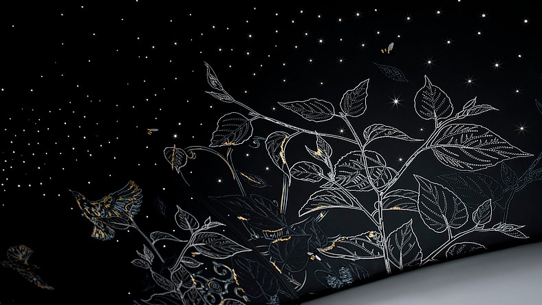 For the Starlight Headliner, 440,000 stitches were used to create a sort of illuminated illustrated timeline. Various scenes reference the mulberry tree under which company founder Henry Royce was photographed in his garden, square-crowned trees found in the courtyard of the automaker’s Goodwood HQ, the honeybees of the Rolls-Royce apiary, and a famous Bluebird Phantom II owned by famed motoring journalist Sir Malcolm Campbell.