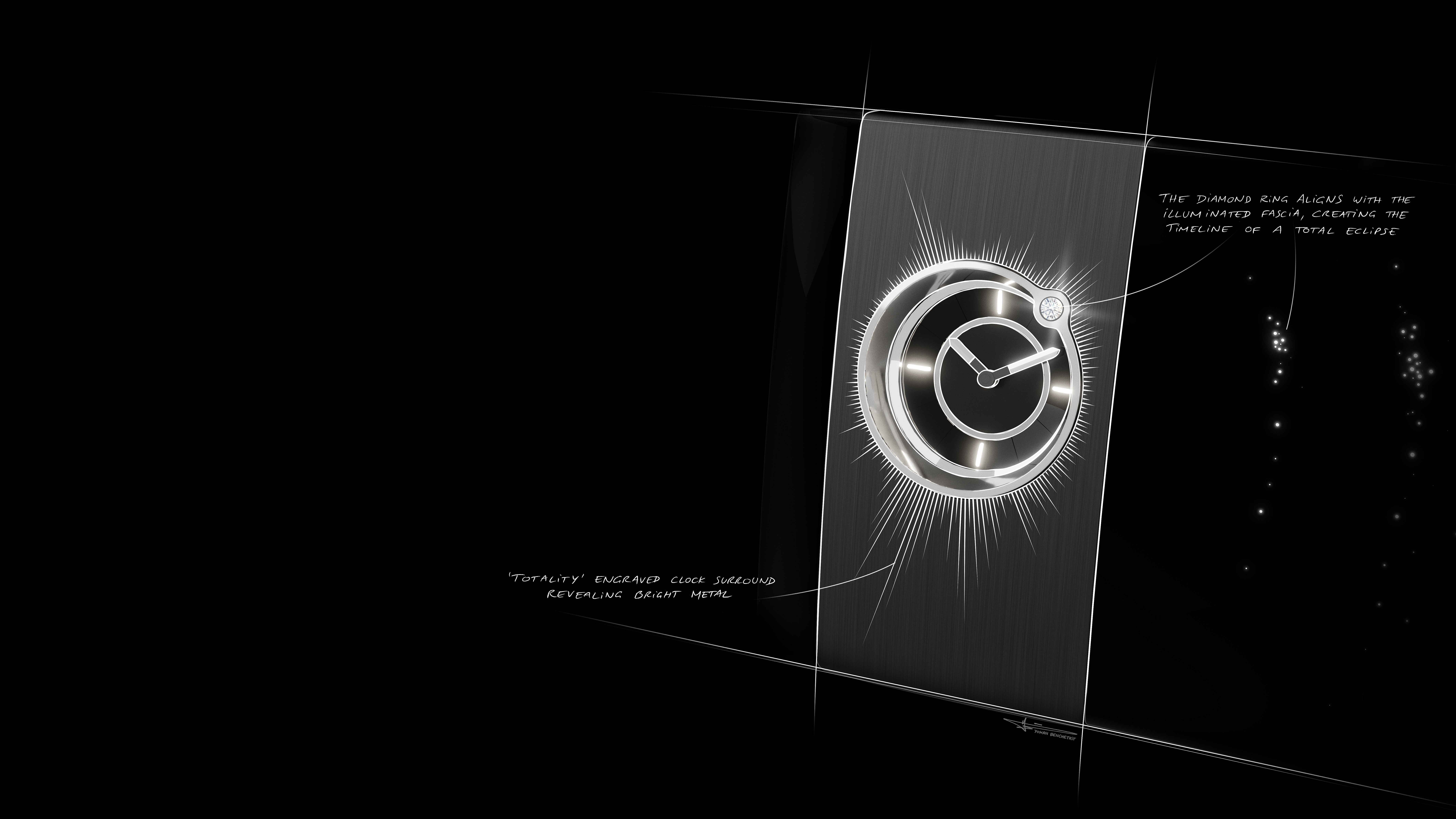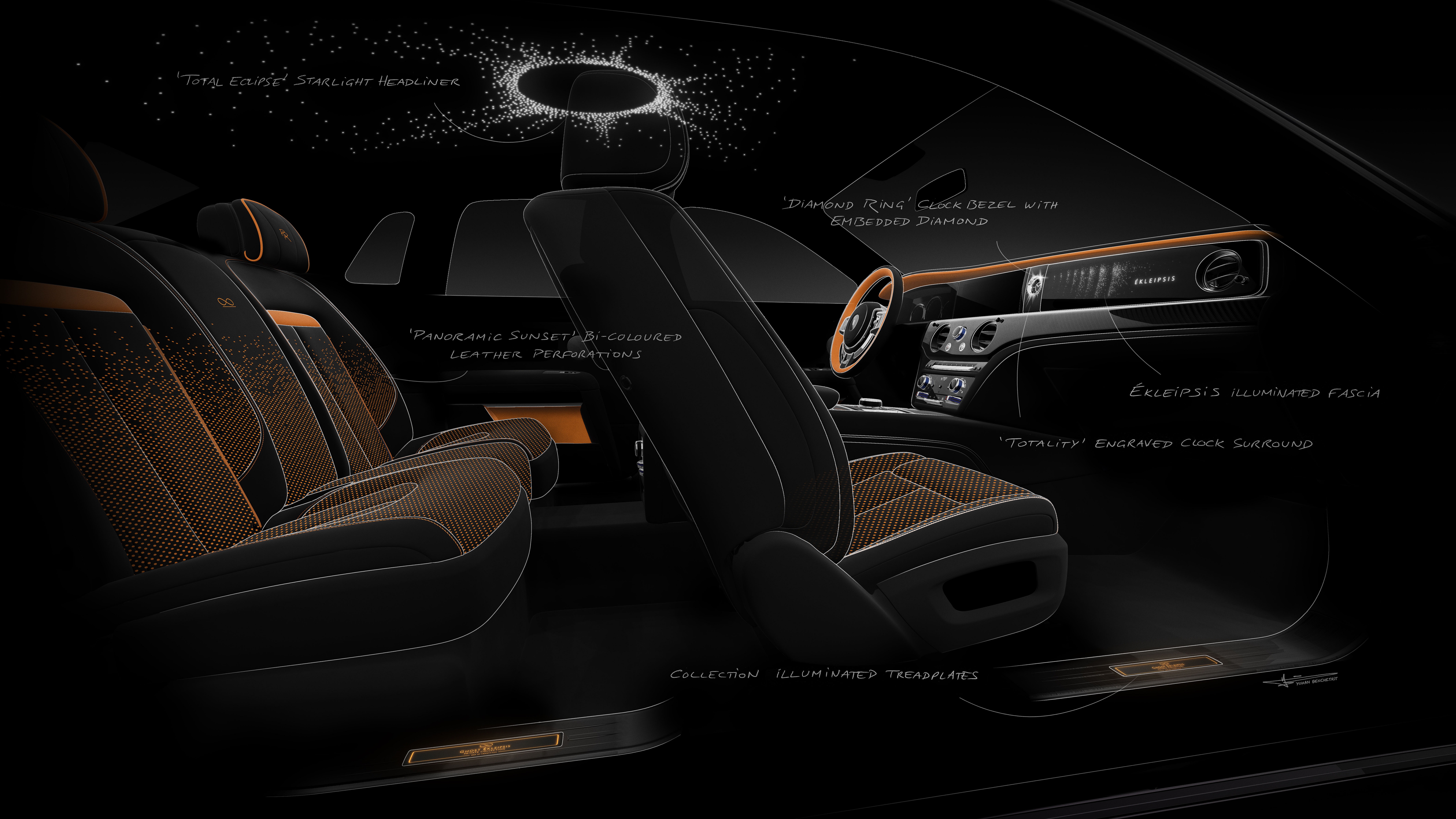 Additionally, the illuminated dashboard is emblazoned with 1,846 laser-etched “stars” and a bespoke timepiece, featuring a .5 carat diamond in reference to the eclipse’s “diamond ring” that forms in the split seconds just before and immediately after the moon obscures the sun. Bi-colored seats clad in tinted black Mandarin leather are covered in 200,000 individual perforations, revealing a solar-like orange hue beneath.