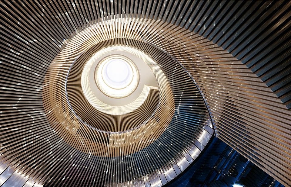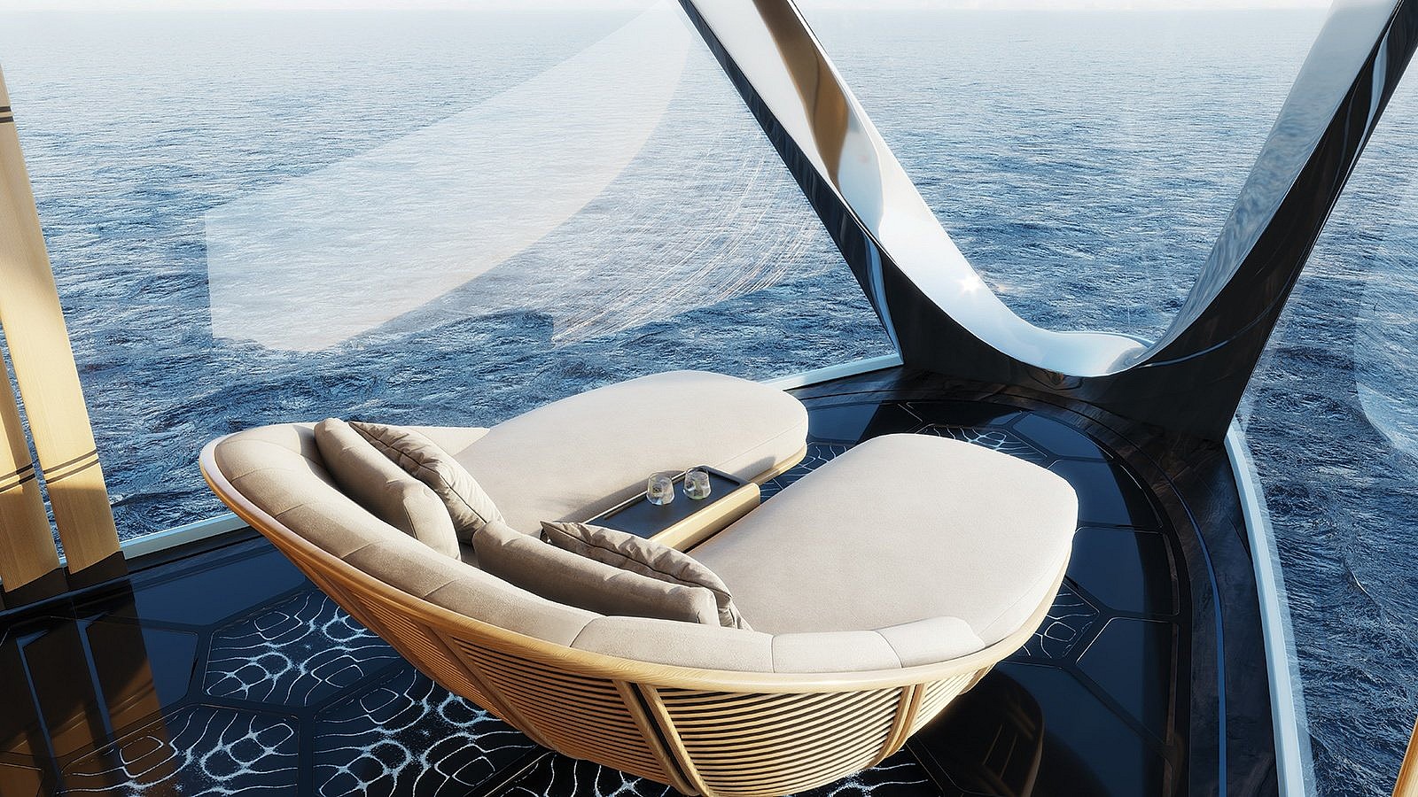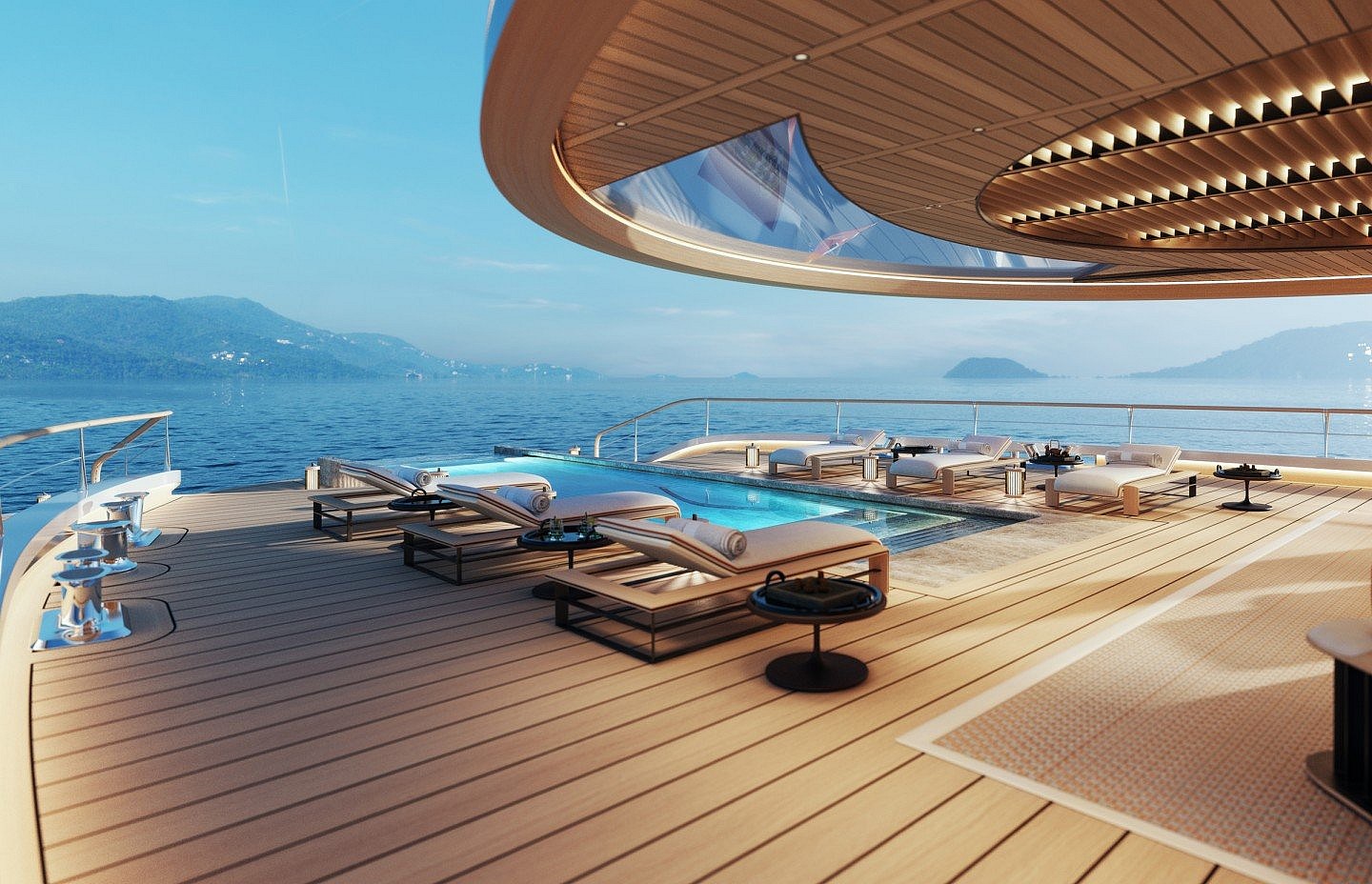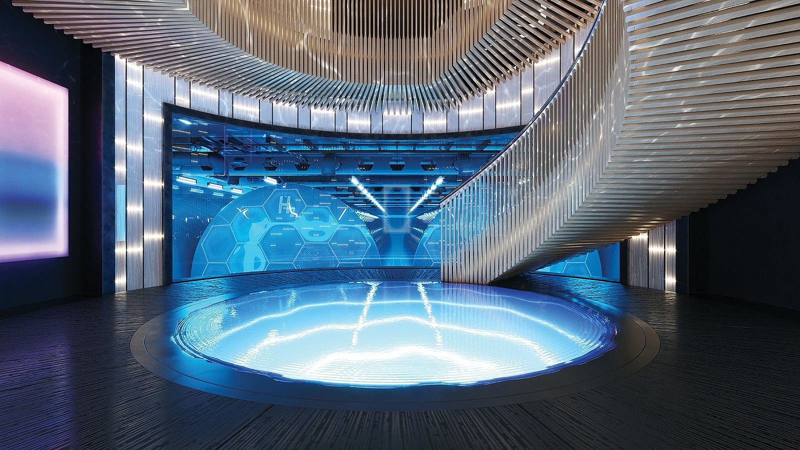 Below deck is an indoor health and wellness center with a water massage room, yoga space and workout floor. The most striking feature might be a giant spiral staircase that provides access to all decks, as well as a look at the glass-enclosed hydrogen tanks.