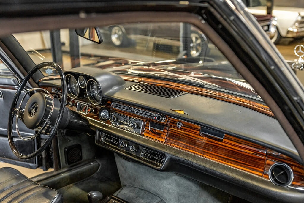 The seller warns of interior ware on the black leather-upholstered bucket seats and rear bench, but Kienle renewed wiring, floor insulation, trunk trim, and AC hoses. The dash is finished in a particularly retro zebrano wood and houses a Becker Mexico cassette stereo, a 160-mph speedometer, and analog clock and auxiliary gauges.