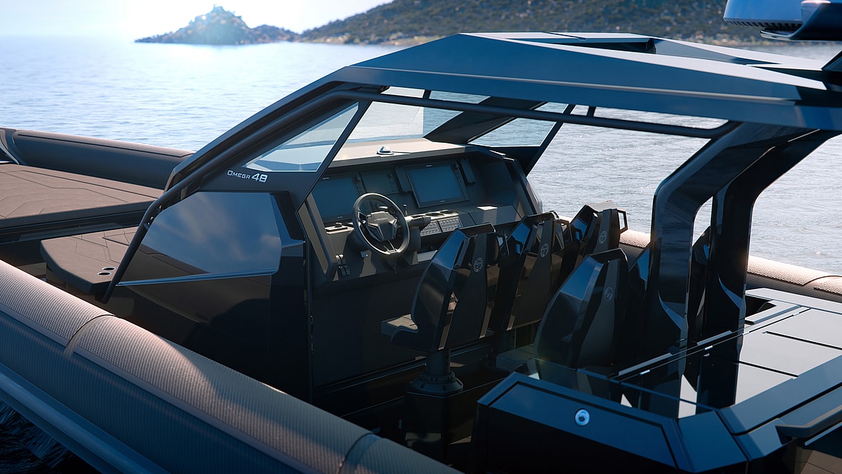The new Omega 48 will be similarly impressive on the water, with propulsion options ranging from twin 600-horsepower motors to a five-engine layout, each engine producing 450 horsepower. The propulsion options do slightly affect overall length—50 feet with inboards, 49 feet with outboards.