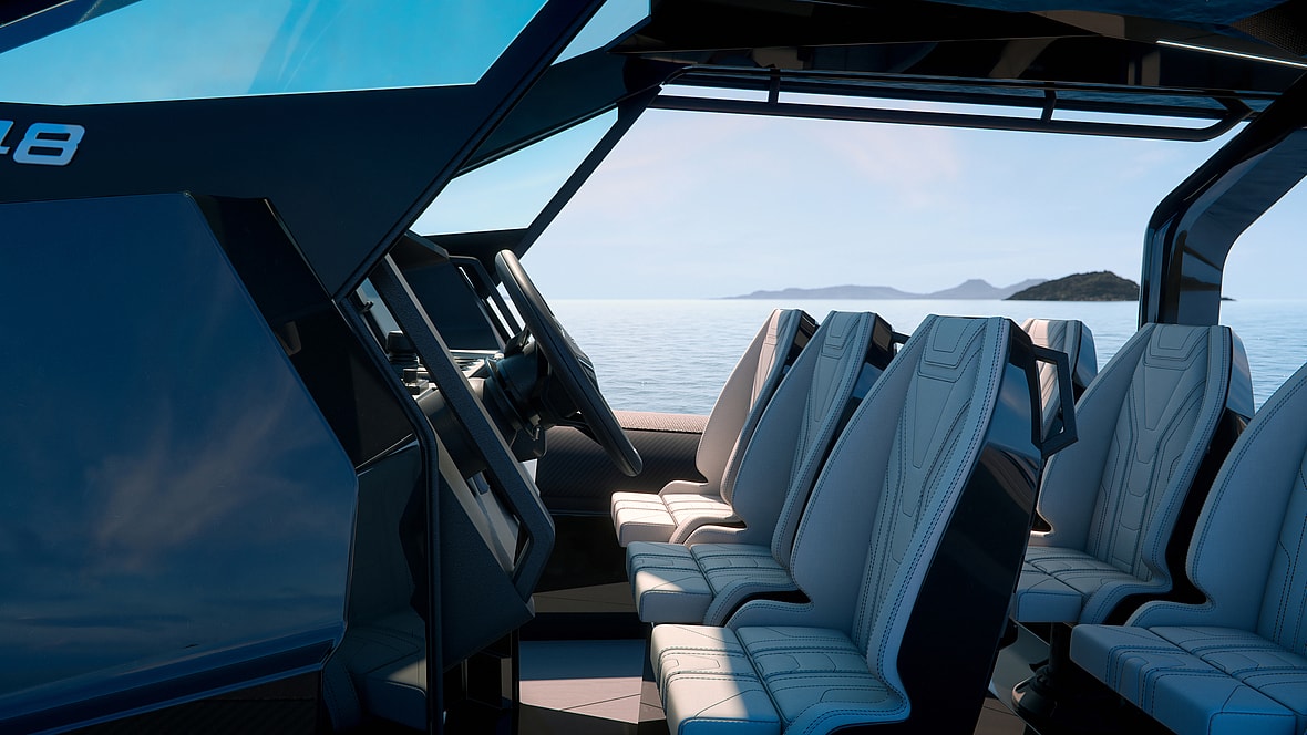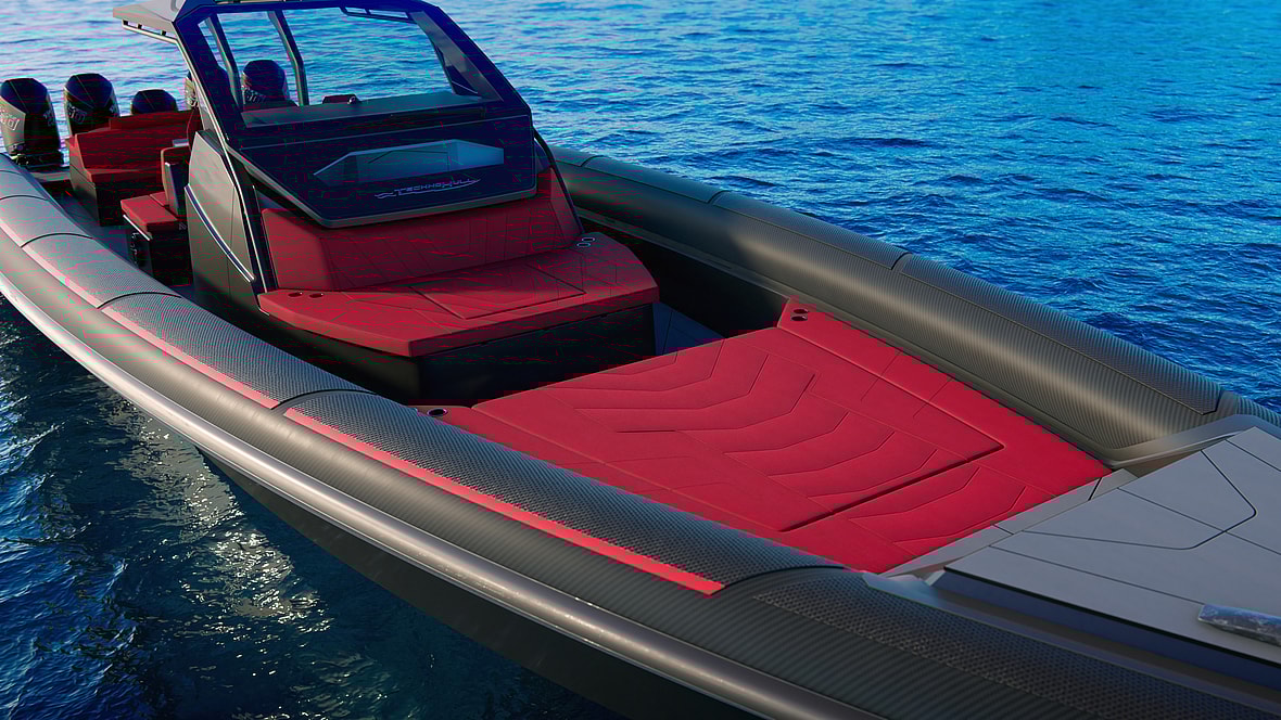 The nearly 50-footer boasts a category-best 15.5 feet of deck space for a performance vessel in a layout new to Technohull. Underneath a new hardtop and behind a full glass windshield are two rows of shock-absorbing seats, as well as a large island sunbed in the aft deck and another at the bow, according to Robb Report.