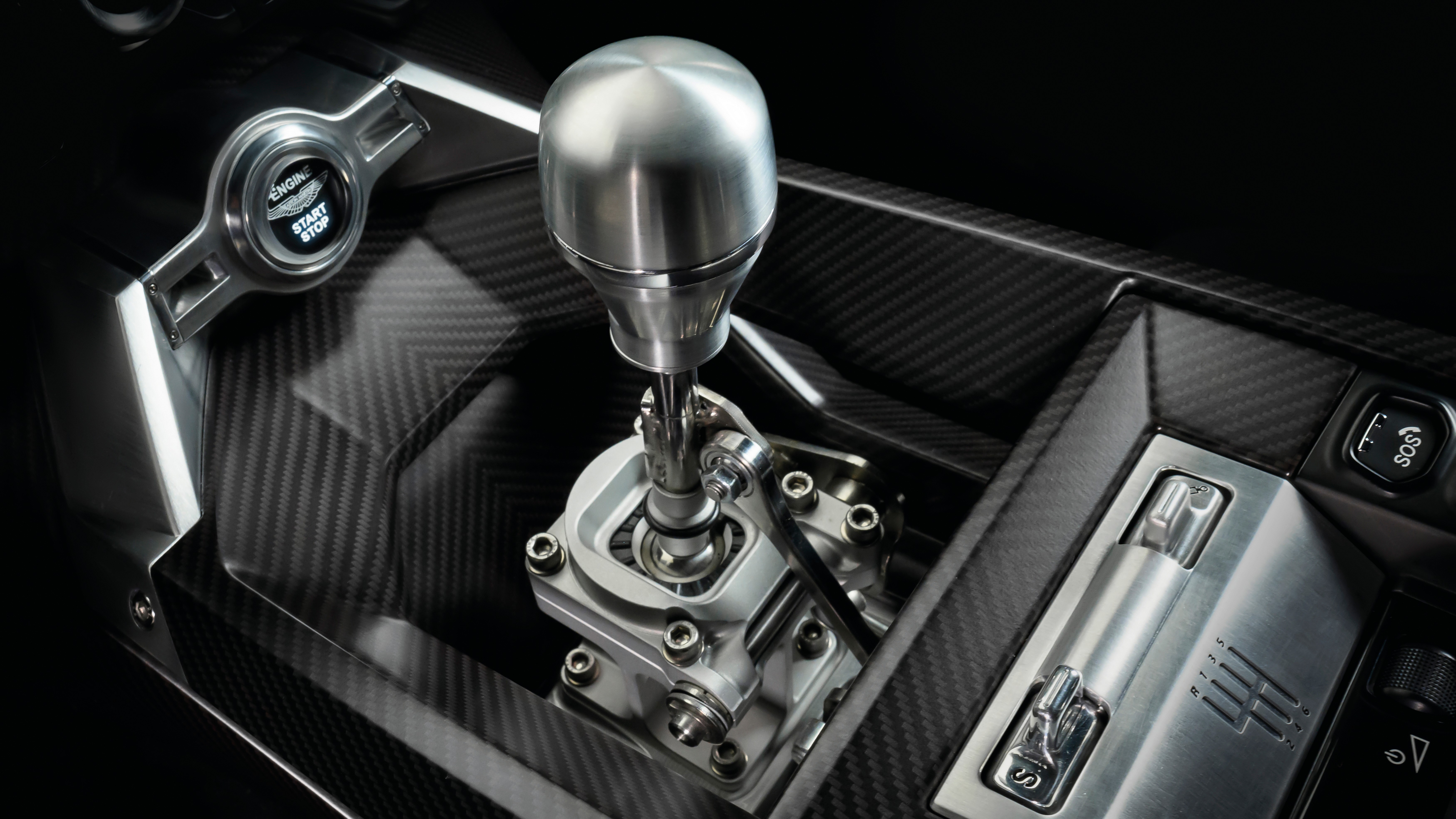 Back to what can be appreciated in imagery, the interior features what has to be the coolest shifter fitted to any car in years. Rising from a raw carbon fiber bowl, the polished metal stick and its bespoke spherical knob are completely uncovered, exposing their mechanical housing. Aston also cut a slit in the tunnel between driver and passenger to expose the linkage to the transaxle, creating a semi-skeletonized transmission and a hardcore aesthetic. A built-in half-cage as-standard together with bespoke trimmed Recaro Podium seats, further underscoring the “race car for the road” assignment.