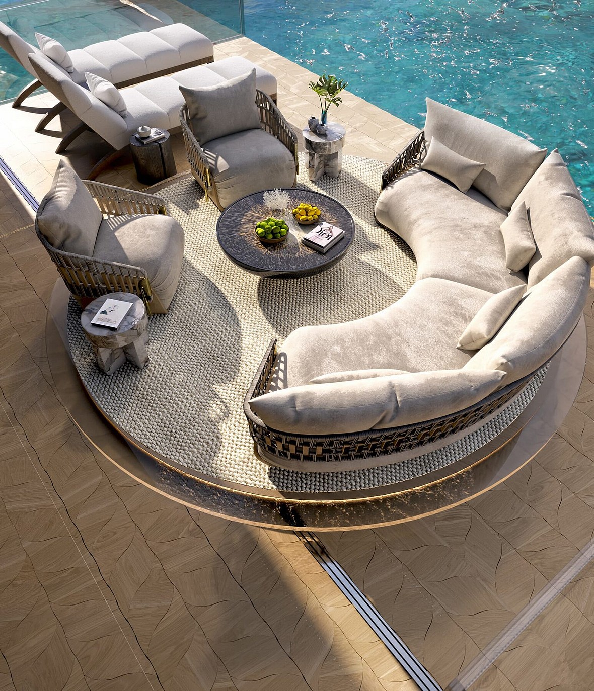 The main deck features an integrated pool and lounging area to the stern with stairs descending to the beach club. The main deck lounge welcomes all passengers, leading them up a staircase into the inner atrium. Adjacent to the gym and open exterior atrium are two guest suites.