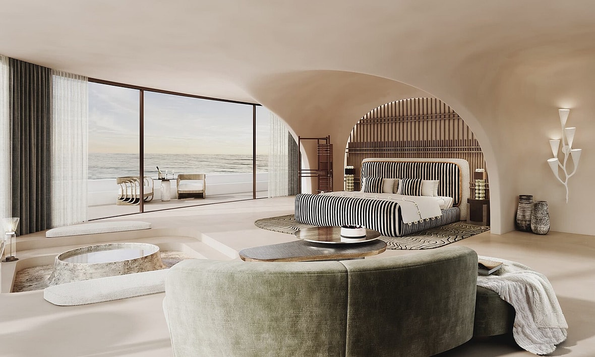 Two additional guest suites and two VIP suites reside on the lower deck, just a short distance away from a beach club boasting fold-down terraces for waterside lounging. A sit-up bar is also strategically positioned beneath the main deck’s pool, creating yet another area of visual interest.