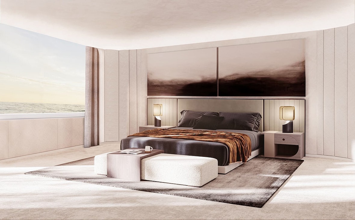 At the very top is a bar, relaxation area and private owner’s deck. The next level down is the upper deck, which houses the “cocoon-like” master suite featuring panoramic views, a sunken bath, private seating nook, and a scenic aft deck.