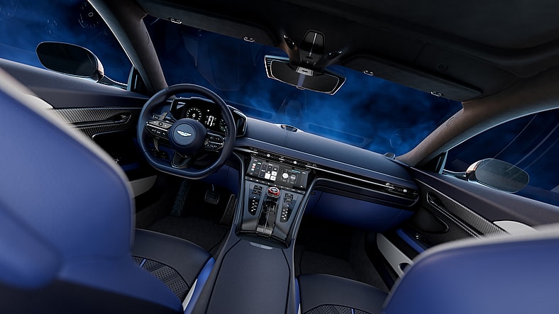 The interior is also distinguished from the standard DB12 via a red anodized finish to the drive mode rotary controller, as well as red seatbelts, seat welts, contrast stitching and headrest embroidery. Optionally, customers can select an Alcantara heated sports steering wheel or have the Aston wings applied to the headrests with an industry-first embossing/debossing technique, which promises “unprecedented precision and sculptural depth.”