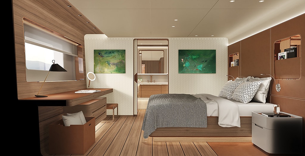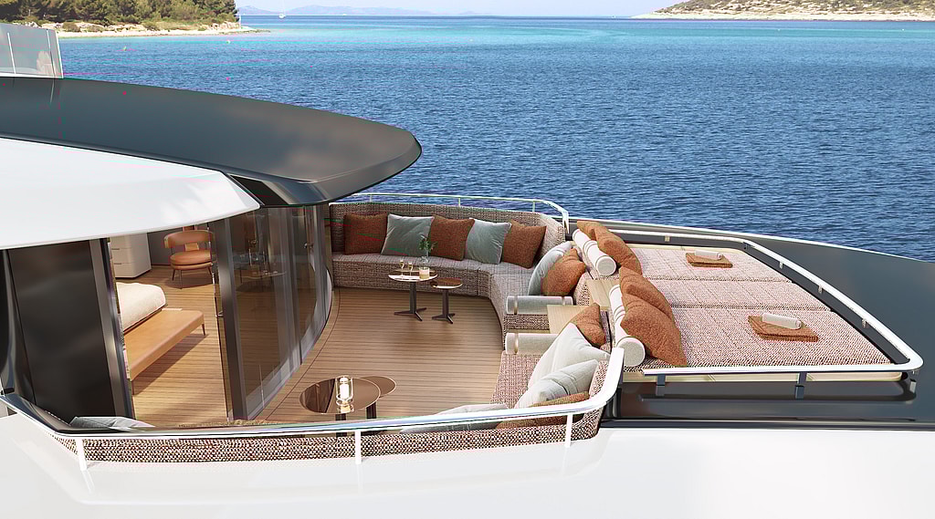 According to the company, the four-deck design is distinct in that it revolves around the positioning of the master suite in the bow on the upper deck, where occupants revel in views offered by floor-to-ceiling windows and a private terrace complete with a sunset solarium.